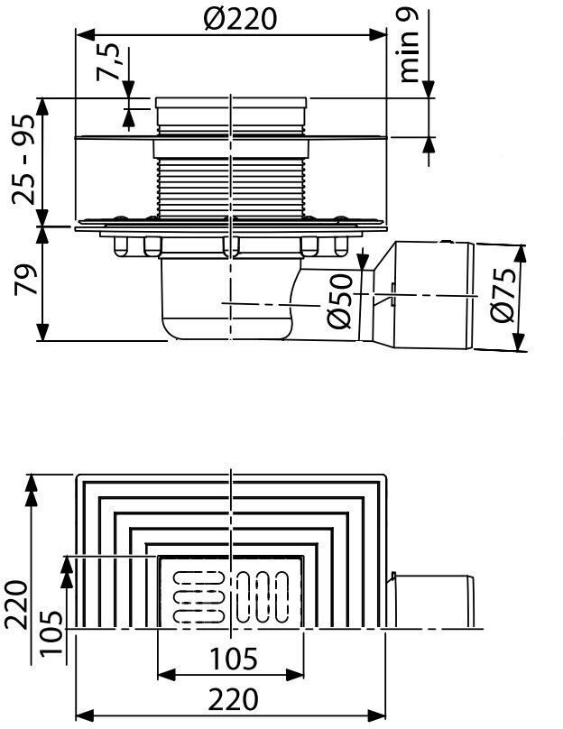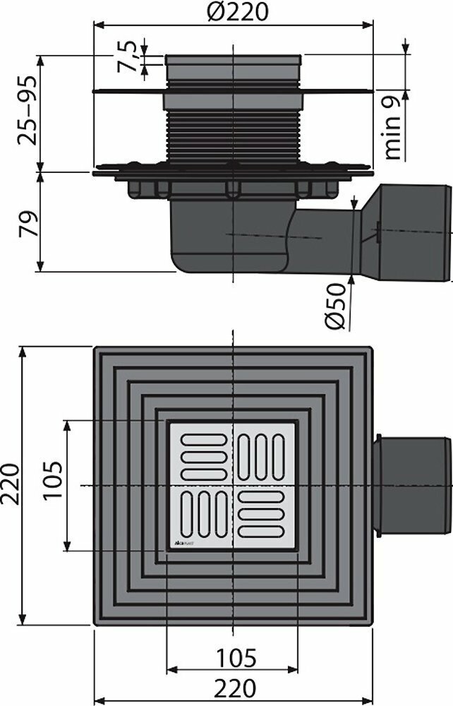 Продукция чешской компании AlcaPlast проста в установке и эксплуатации и обладает универсальным дизайном. Душевой трап AlcaPlast изготовлен из высококачественного пластика. Модель имеет квадратную форму и боковой выпуск. Перфорированная декоративная решетка выполнена из нержавеющей стали, выдерживает нагрузку до 300 кг. Трап может быть отрегулирован по высоте на расстояние до 9 см.