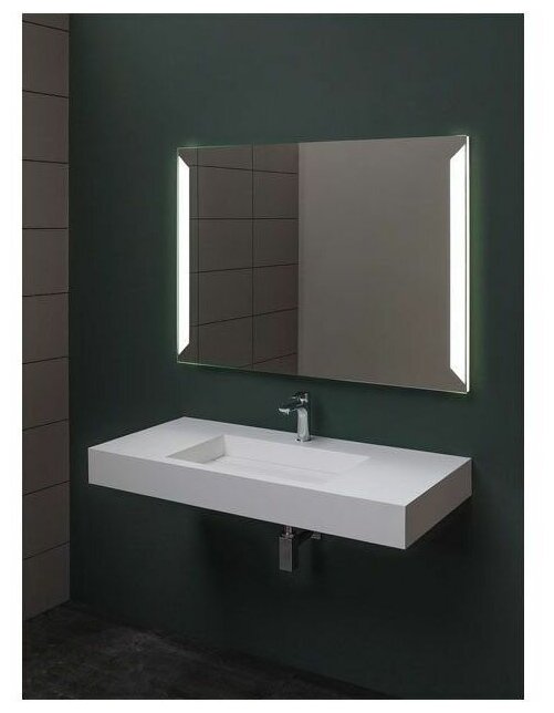 Зеркало Aquanet составляет единое целое со светильником. Это четырехугольная подвесная конструкция размером 110х85 см, на которую нанесена зеркальная амальгама высокого качества для достижения лучшего отражающего эффекта. Причем, с двух сторон оставлены без зеркального покрытия участки трапециевидной формы. Внутри встроен LED-светильник, при включении которого свет проникает через боковые части конструкции, создавая подсветку как бы изнутри самого изделия и через участки, на которые не нанесено зеркальное покрытие. В результате светильник образует оригинальной формы светящуюся рамочку для зеркала. Она создает в ванной легкую подсветку, которая не режет глаза и излучает приятный свет, и, к тому же, придает самому изделию привлекательный вид. Включение/выключение светильника осуществляется с помощью инфракрасного датчика, к которому надо просто поднести руку.