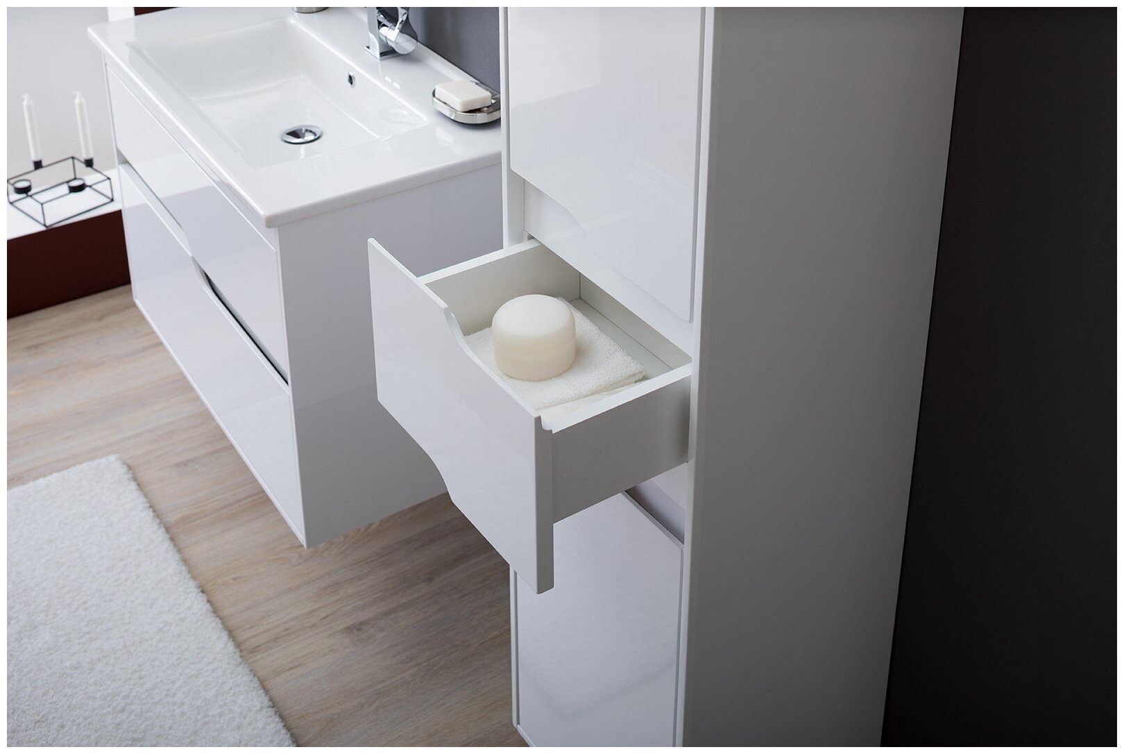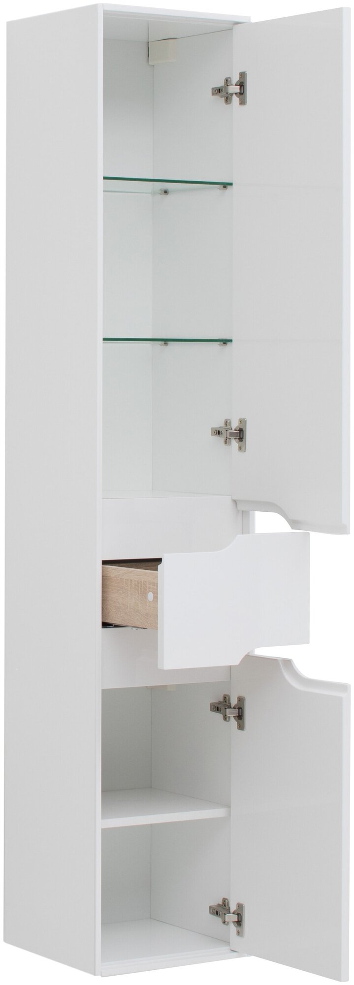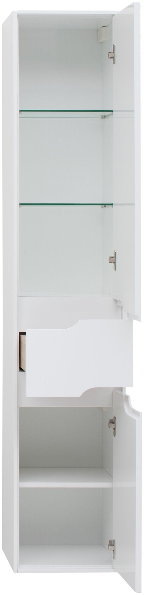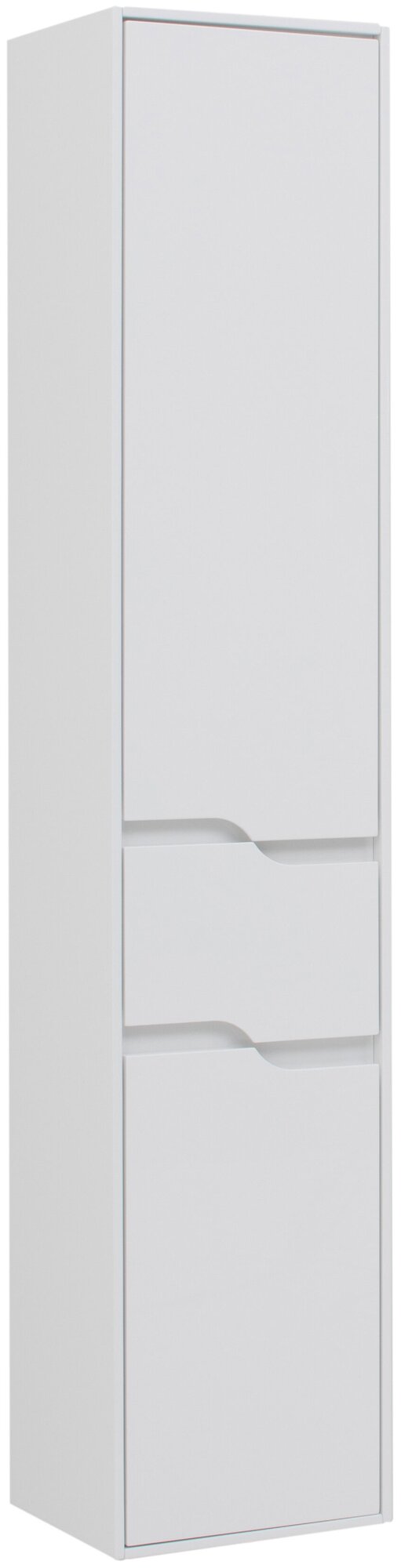 Шкаф-пенал Aquanet Модена 35 белого цвета предназначен для тех, кто хочет создать особую атмосферу в своей ванной комнате, кого привлекает все оригинальное, но кто при этом отдает должное традициям, практичности и функциональности. Привлекательной деталью служат интегрированные ручки в виде зигзага, напоминающего молнию, что очень освежает внешний вид этого простого по форме предмета мебели. Белоснежные корпус и фасад пенала выполнены из влагостойких плит МДФ. Пенал предлагает вместительную зону хранения за двумя распашными дверцами и внутри расположенного между ними выдвижного ящика, предназначенного под мелкие предметы. Механизмы выдвижения снабжены доводчиками известного немецкого производителя фурнитуры Hettich. Тумба предусматривает подвесную систему монтажа.