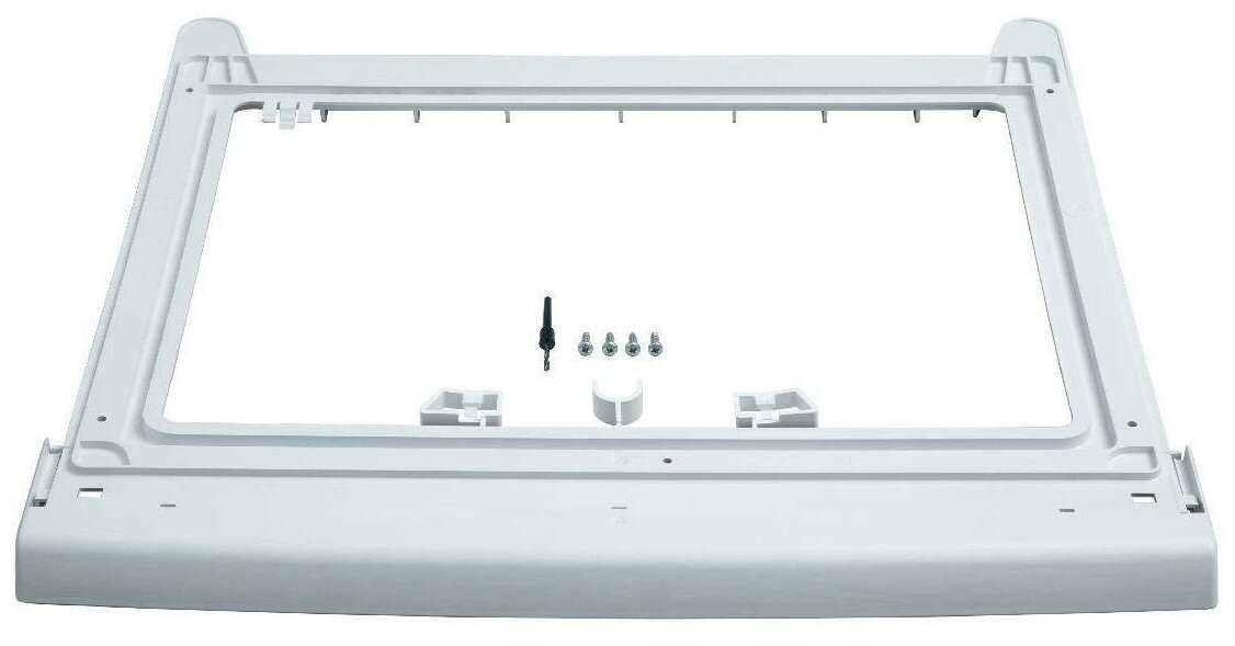 Соеденительный элемент установили с сушильной машиной Bosch WTX87KH10E. К качеству претензий нет. В выдвижной полке могли бы сделать доводчики. Для установки стиральной и сушильной машин в колонну в одной плоскости не предусмотрена разметка для ровной установки, поэтому перфекционистам с монтажом придётся повозиться.