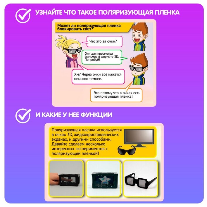 Японские опыты Науки с Буки . Каким бывает свет и как его лучи влияют на наше зрительное восприятие? Что такое поляризующая пленка и где она применяется? Ребенок узнает об этом, проведя серию увлекательных опытов из научно-познавательного набора «». Эти веселые эксперименты могут превратиться в забавную и полезную игру, если проводить их с кем-то из друзей или взрослых. Можно даже показать удивительный фокус гостям, продемонстрировав коробку с невидимой стеной! Ребенок прослывет настоящим магом, а ведь это всего лишь оптическая иллюзия, вызванная свойством поляризующей пленки пропускать и задерживать световые лучи.