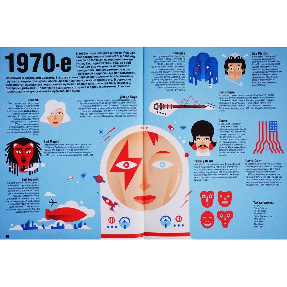 В “Иллюстрированной истории рока” испанцев Сусаны Монтеагудо и Луиса Демано читатели узнают о зарождении рока в Америке, о том, как он добрался до Европы, усложнялся, менялся и стал таким, каким мы его знаем сегодня. Авторы выбрали довольно интересную форму изложения — сочетание коротких информативных статей и инфографики. Они приводят хронологию развития рока с 1950-х до начала XXI века, каждому периоду посвящен отдельный разворот, выполненный в определенном цвете. Там указаны названия групп, имена исполнителей, краткая характеристика их творчества.