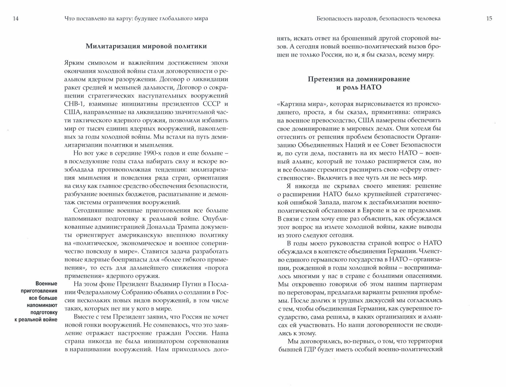 В своей новой книге лауреат Нобелевской премии мира М.С. Горбачев размышляет о том, как надо действовать сегодня, к чему стремиться, чего избегать, если мы хотим сохранить мир для потомков. Он утверждает, что человечество уже живет в глобальном мире, но не вполне понимает этот мир и меру своей ответственности за него, только учится себя вести в этих новых условиях. Это касается и экономической модели развития, и демократии, и отношения к окружающей среде. Горбачев предупреждает о нарастающей милитаризации международных отношений, создающей огромную угрозу будущему человечества. В центре его внимания кризис доверия между Россией и Западом, который необходимо преодолеть в обоюдных интересах.