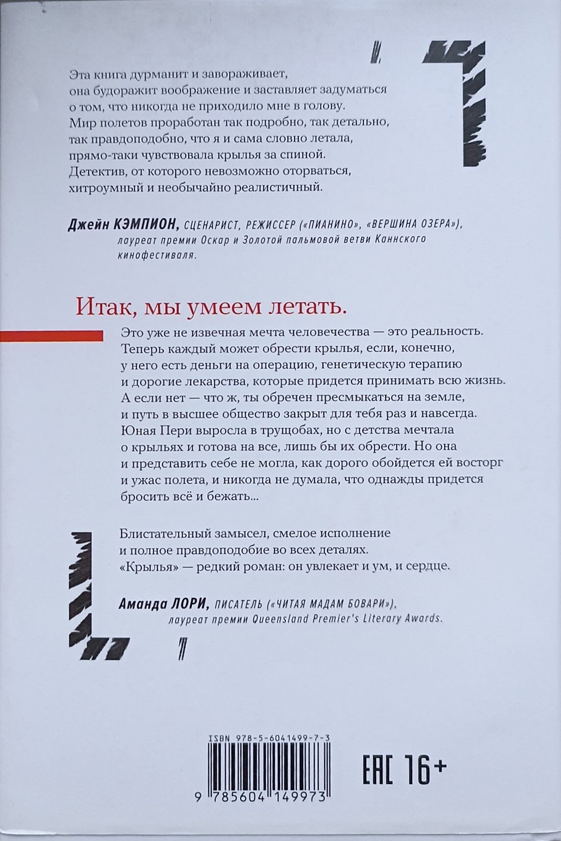"Фантастический детектив, от которого невозможно оторваться, хитроумный и необычайно реалистичный", - так сказала о романе "крылья" Джейн Кэмпион - всемирно известный режиссер, лауреат премии "Оскар" и Золотой пальмовой ветви Каннского кинофестиваля.