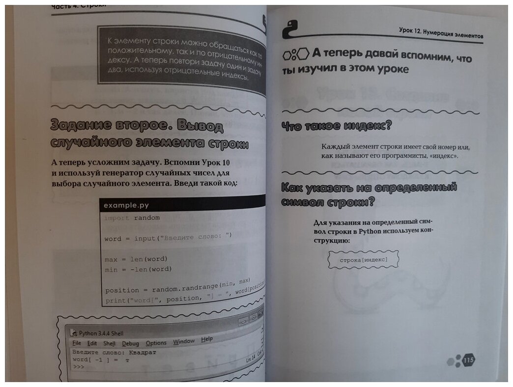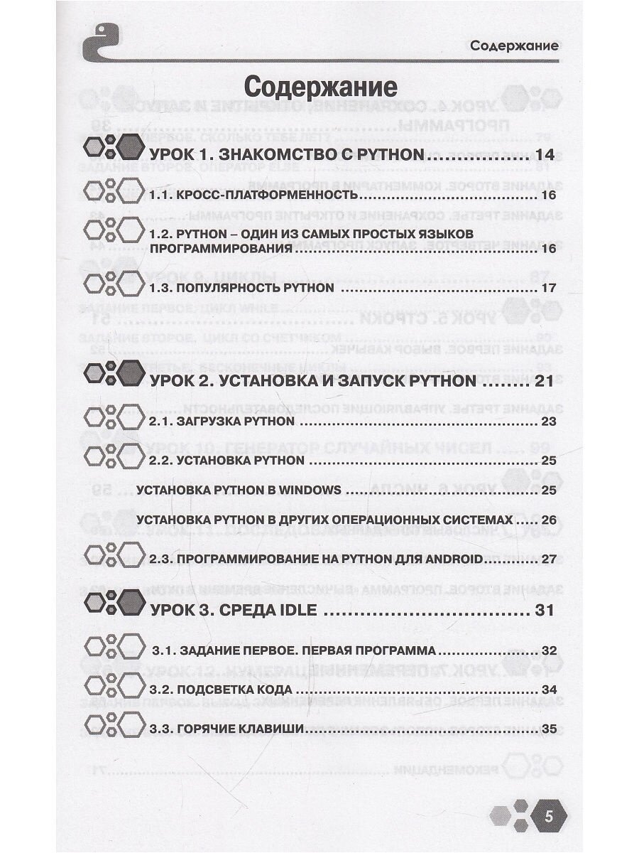 Сама книга состоит из последовательных заданий, которые вы будете выполнять под чутким руководством автора книги. Вы сами напишите свои первые программы на Python, узнаете, как работает программный код, как использовать логические операторы, циклы, условия, списки и другие элементы программирования. В последних заданиях ваших приобретенных знаний и навыков хватит, чтобы создать собственную полноценную игру!