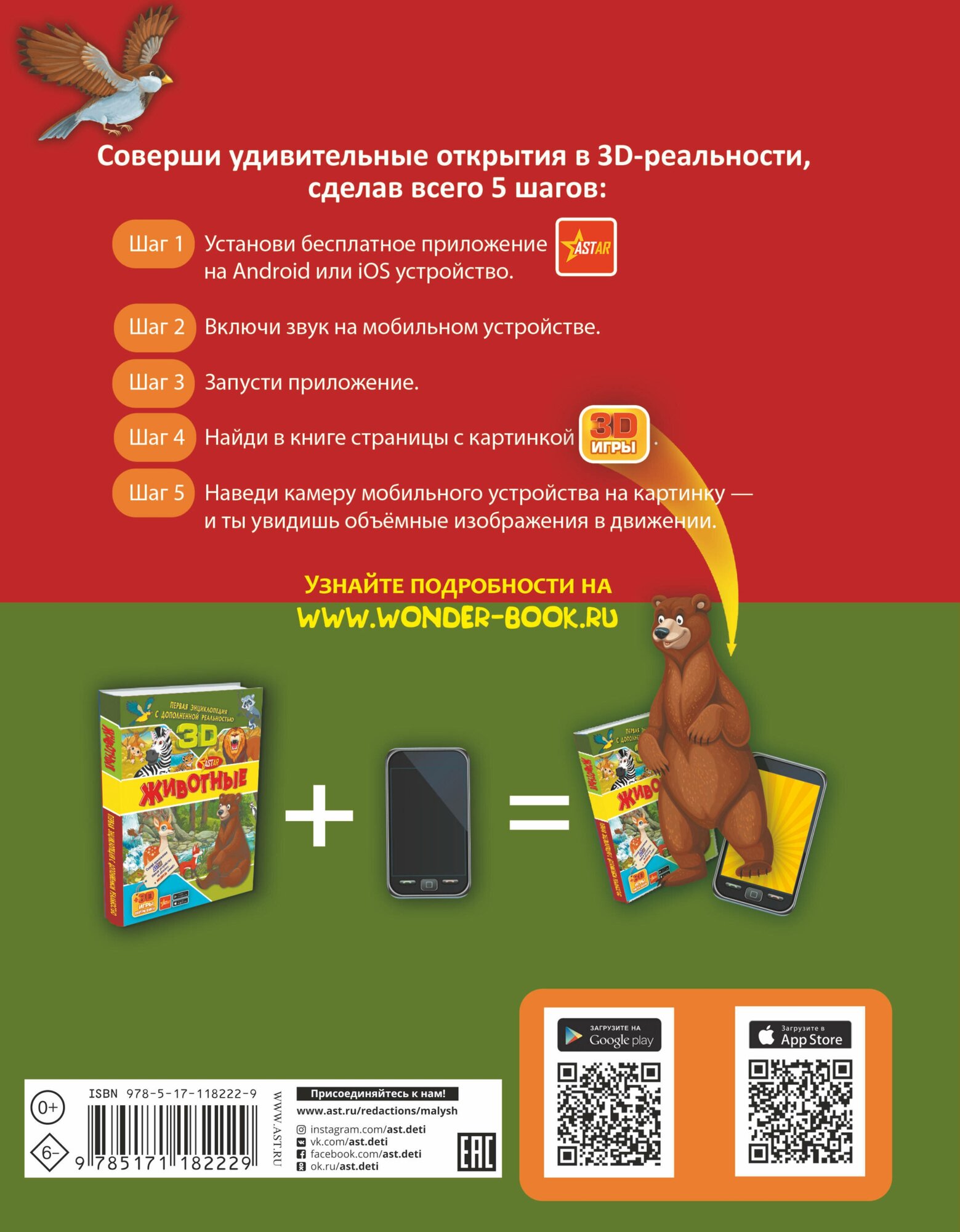 Книга "Животные" - это необычная 3D-энциклопедия, которая познакомит тебя с птицами, зверями, рыбами, насекомыми и другими обитателями разных уголков Земли. Здесь ты сможешь о них не только прочесть, но и послушать голос царя зверей - льва, покормить крокодила, полюбоваться прыжками весёлых дельфинов и даже помочь орлу перелететь через высокие горы. Как? Всё просто: выполни несложные инструкции, чтобы планшет или смартфон превратились в пульт управления. Одно движение руки - и прямо на глазах "оживут" обитатели жаркой Африки, холодного Северного полюса и диких амазонских джунглей. Л может быть, ты всегда мечтал подружиться с ловкими и сообразительными обезьянками? Открой книгу, и это у тебя обязательно получится!