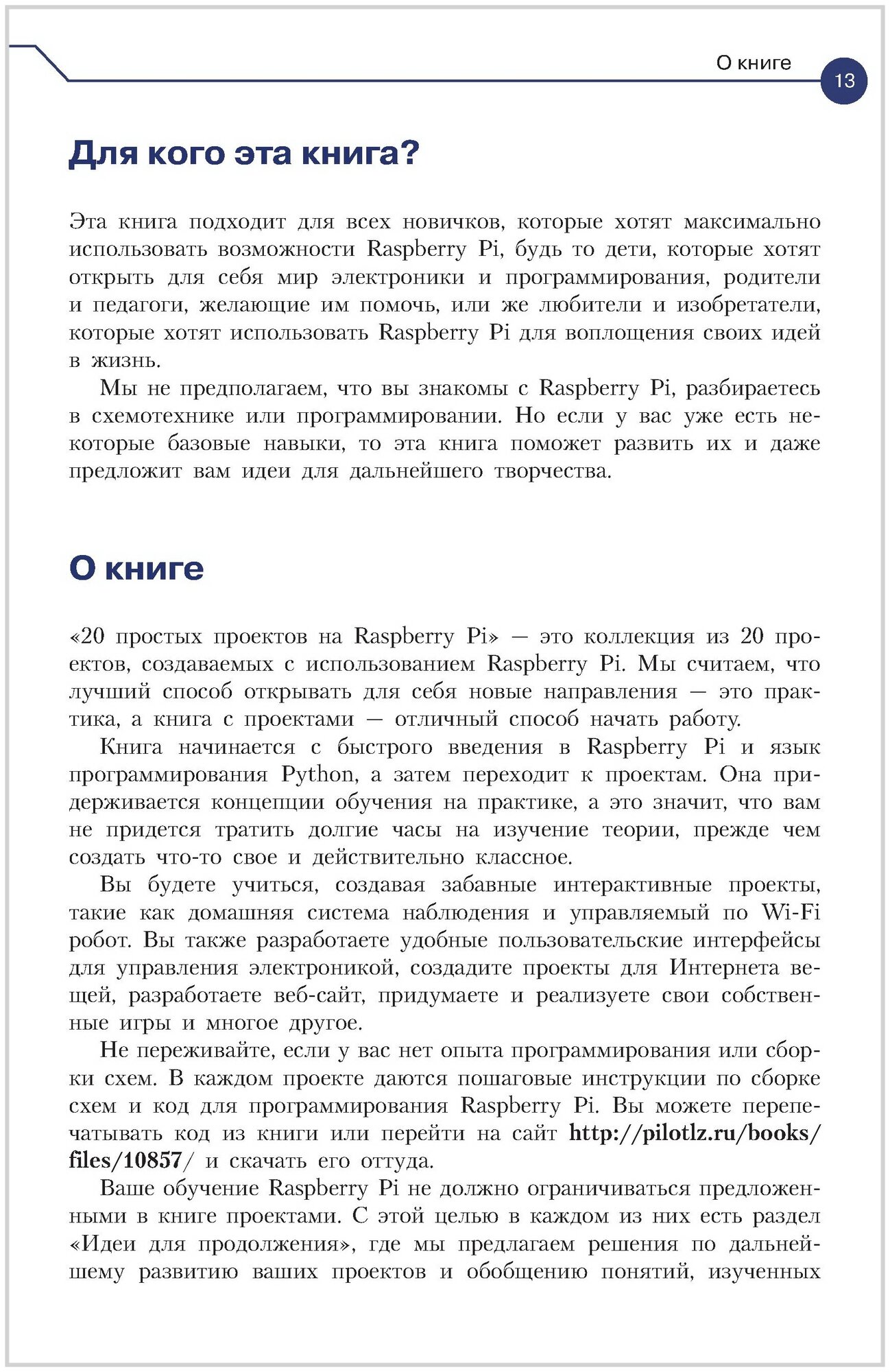.Мы совсем не предполагаем, что вы знакомы с Raspberry Pi и к тому же разбираетесь в схемотехнике или программировании. Этому вы научитесь, прочитав книгу. Но если у вас уже есть некоторые базовые навыки, то эта книга поможет развить их и дать вам идеи, что делать дальше.