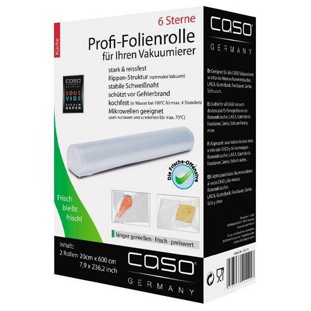 | Особенности и характеристики | Рулоны для вакуумной упаковки CASO VC - это два рулона профессиональной пленки размером 20 x 600 см для вакуумной упаковки с ребристой внутренней поверхностью для оптимального вакуумирования. Высокая прочность пакета допускает замораживание, использование в СВЧ печи, готовку по технологии Sous-Vide. |
