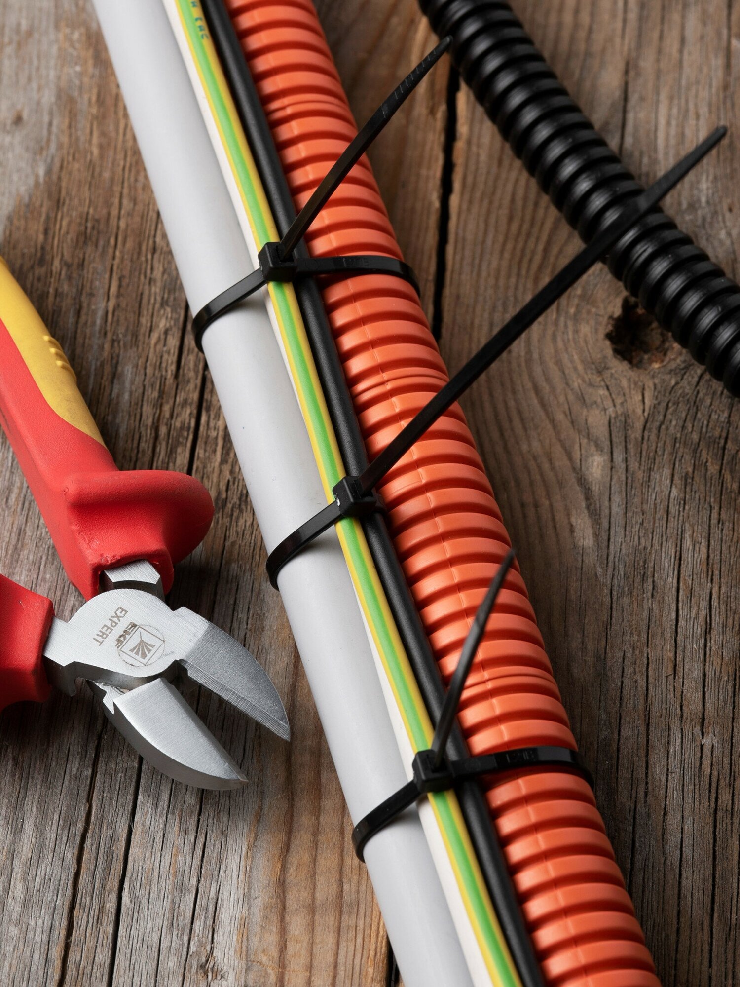 Хомуты серии FlexLock предназначены для увязки кабелей и проводов в пучок и монтажа кабельных линий и проводников. Изготовлены из полиамида 6.6, который обладает хорошей устойчивостью к маслам, смазкам, масляным производным, хлоридным растворителям, устойчивостью к слабым кислотам и УФ-лучам. Кабельные стяжки серии FlexLock имеют самофиксирующийся ремешок с блокирующим механизмом. При производстве кабельных стяжек черного цвета добавляется угольный порошок, который является одним из наиболее эффективных стабилизаторов. Он улучшает физические свойства продукции в стойкости к погодным условиям и УФ-излучению (прямые солнечные лучи). Наборы хомутов в банках представляют собой кабельные стяжки наиболее распространенных габаритов и разных цветов собранных в одной пластиковой упаковке. Благодаря прозрачной пластиковой упаковке такие наборы легко транспортировать и легко идентифицировать какой цвет и габарит хомута находится в упаковке. Разные цвета очень удобны в применении в быту и для маркировки. ПРЕИМУЩЕСТВА. Класс воспламеняемости сырья: UL 94-V2. Материал: Nylon 6.6, самозатухающий, без галогенов. Высокий диапазон рабочих температур. Широкий диапазон габаритов – шириной от 2,5 до 12,4 мм и длиной от 8 см до 1 м. ПРИМЕНЕНИЕ. Хомуты предназначены для увязки кабелей и проводов в жгут и монтажа кабельных линий и проводников, как внутри помещений, так и снаружи.