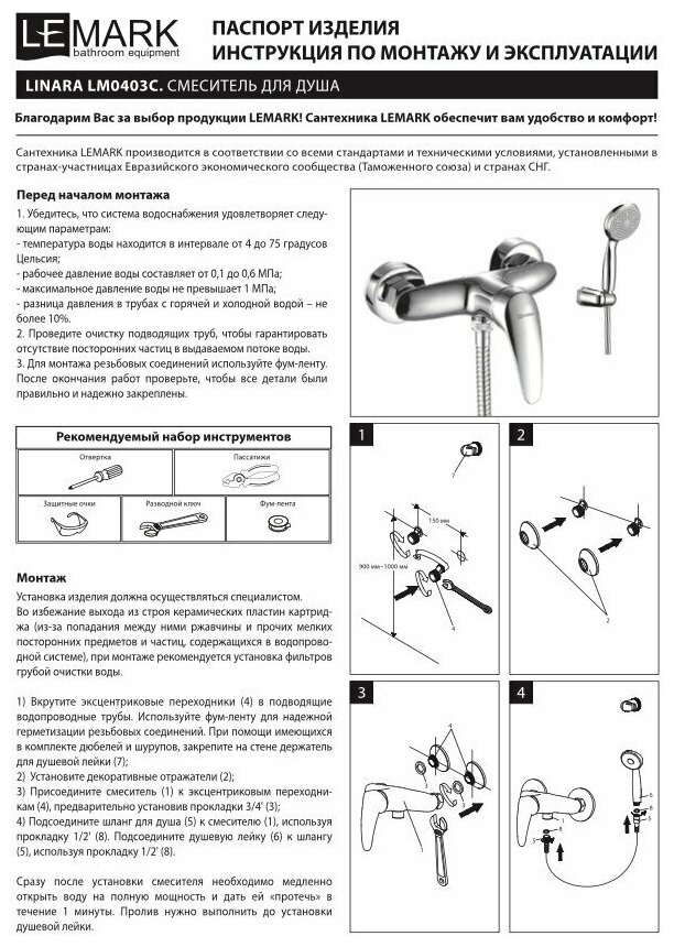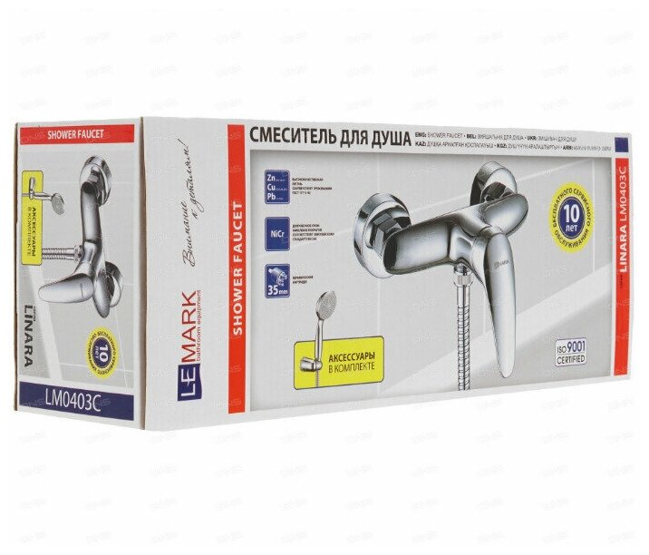 | ВКоробке | Смеситель - 1 шт. Душевая лейка - 1 шт. Душевой шланг - 1 шт. Настенный держатель - 1 шт. Эксцентрики - 2 шт. Инструкция - 1 шт. |