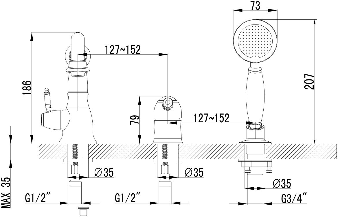 | Размещение ручной лейки | на борт ванны |