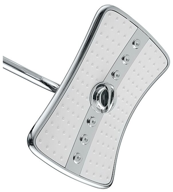 - Верхняя поворотная 2-функциональная душевая лейка «Тропический дождь» 146×227 мм. Режимы: распыление, массаж.