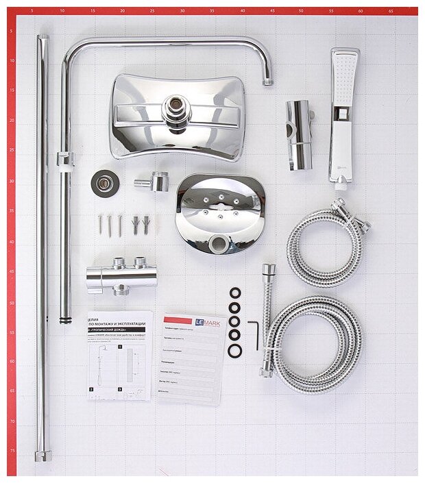 | Комплектация | мыльница, душевая штанга, верхний душ, душевая лейка, душевой шланг, смеситель, держатель для душевой лейки, инструкция |
