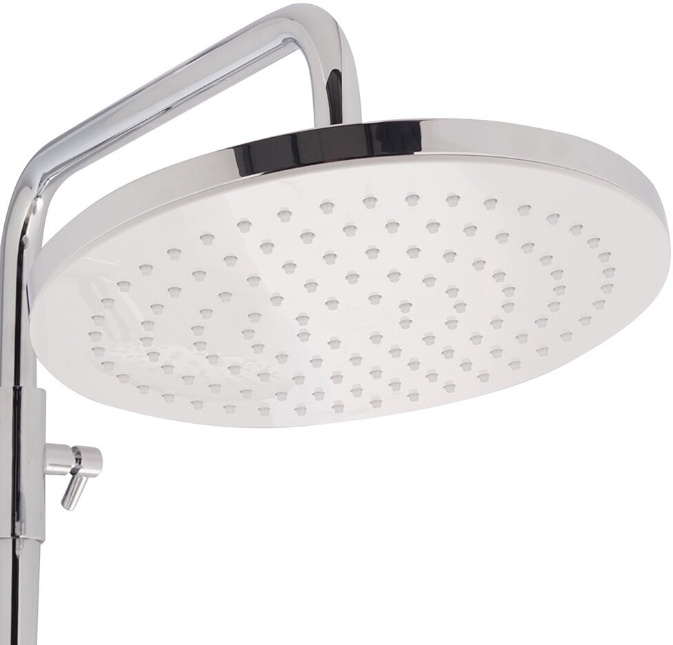 Из особенностей стоит выделить встроенный в излив переключатель с керамическими пластинами, а также верхнюю поворотную душевую лейку «Тропический дождь» диаметром 230 мм.