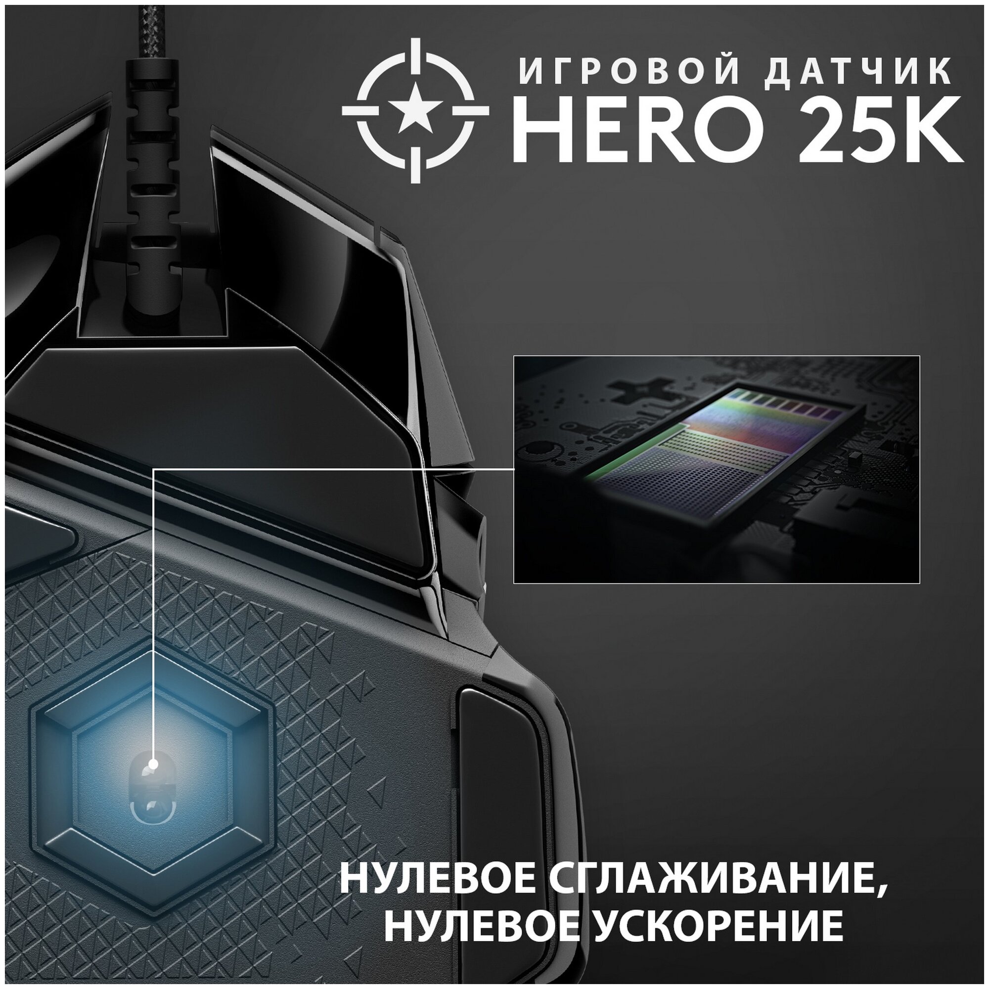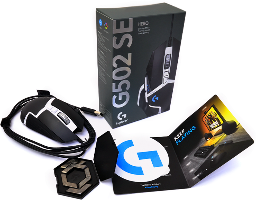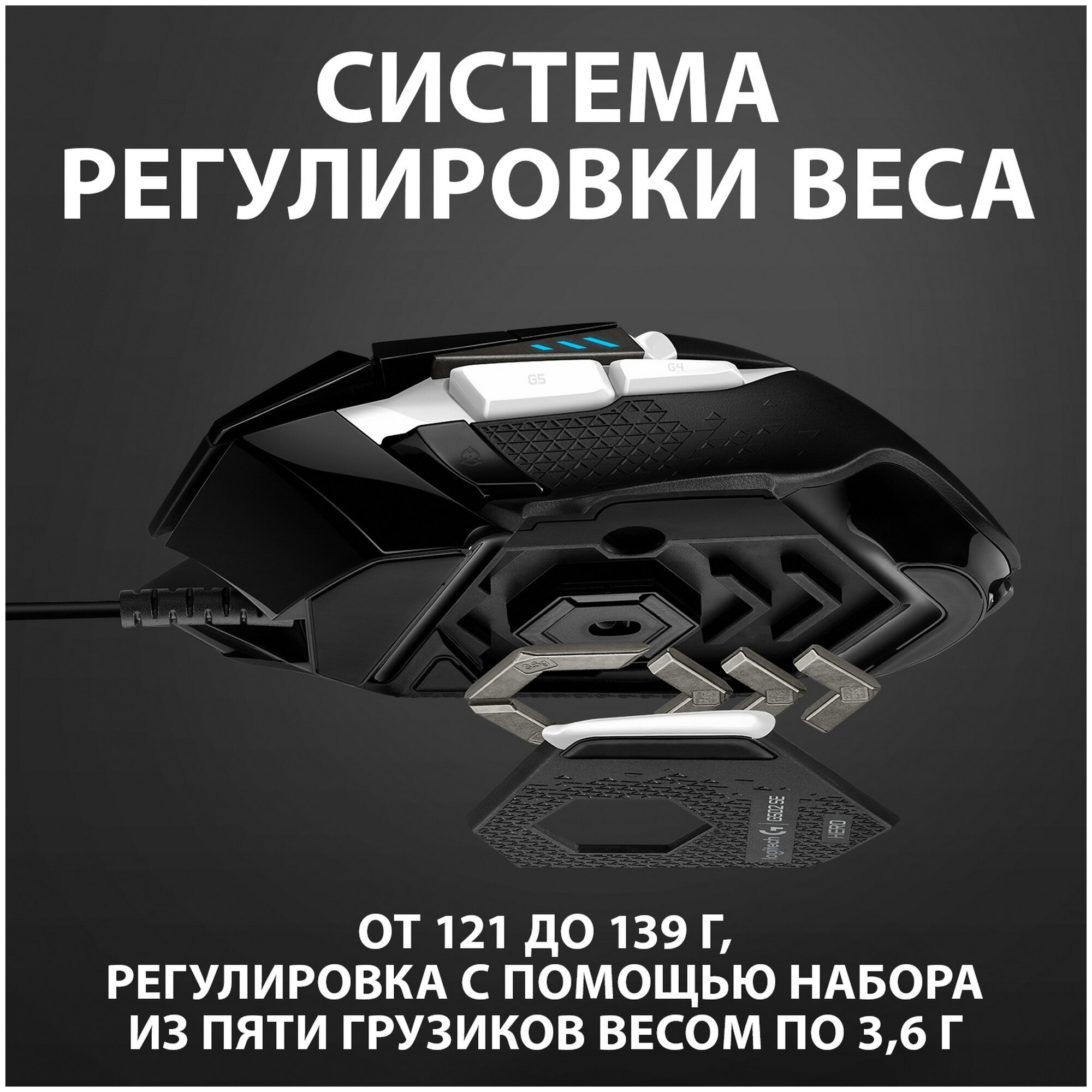 | Дополнительно | RGB-подсветка. В комплект поставки G502 HERO входят пять утяжелителей по 3,6 г, которые в различных комбинациях можно разместить спереди, сзади, слева, справа и по центру мыши. |