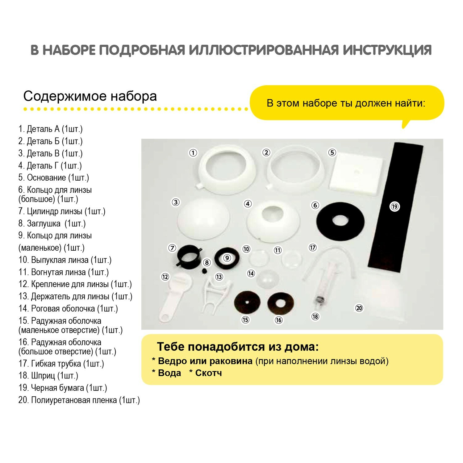 | Состав набора | иллюстрированная инструкция - 1 шт; основные детали - 4 шт; основание - 1 шт; кольцо для линзы большое - 1 шт; кольцо для линзы маленькое - 1 шт; цилиндр линзы - 1 шт; заглушка - 1 шт; выпуклая линза - 1 шт; вогнутая линза - 1 шт; крепление для линзы - 1 шт; держатель для линзы - 1 шт; роговая оболочка - 1 шт; радужная оболочка - 2 шт; гибкая трубка - 1 шт; шприц - 1 шт; бумага - 1 шт; полиуретановая пленка - 1 шт |