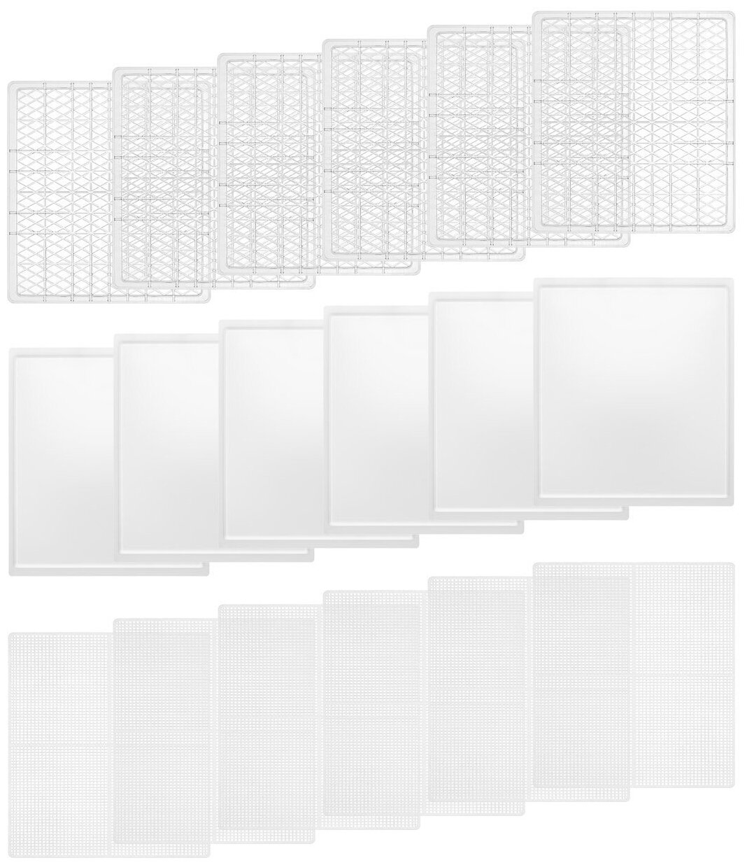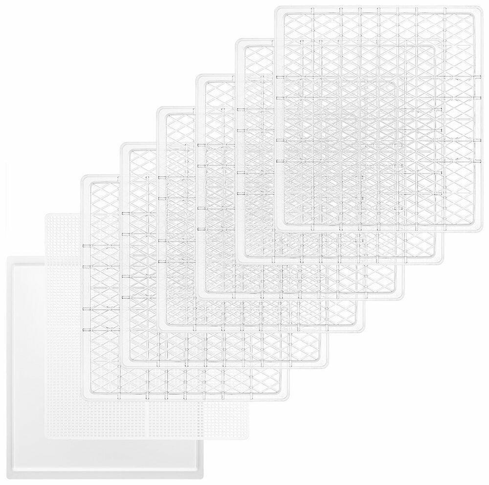 6 пластиковых поддонов, 6 поддонов с бортиками для пастилы и 6 сеток помогут разместить внутри сушки абсолютно любые продукты!