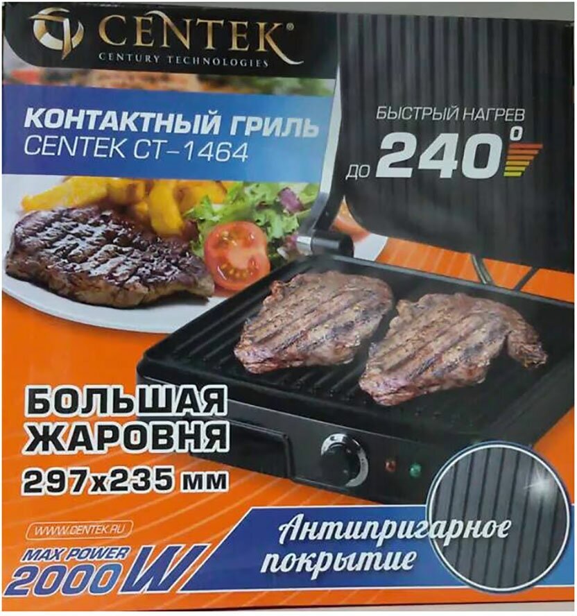 Оборудование Centek CT-1464 действует с мощностью 2000 Вт и нагревается до 240 градусов благодаря наличию закрытого нагревательного элемента, расположенного снизу и сверху. Площадь рабочей поверхности составляет 698 кв.см, чего достаточно для приготовления большого количества пищи. Несмотря на наличие металлического корпуса устройство дополнено термоизолированной рукояткой.