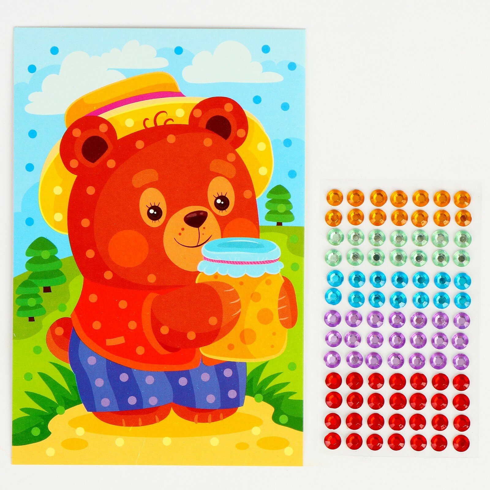 Набор для детского творчества мини-рисунок из страз «Мишка» позволит Вашему ребенку с удовольствием и пользой провести время. Поможет в увлекательной игровой форме развить у ребенка творческие способности, внимание и усидчивость.Игра рекомендована для детей от трех лет.Состав детского мини-рисунка из страз «Мишка»:— картонная основа с рисунком, размером 150х100 мм — 1 шт,— самоклеящиеся стразы из пластика (диаметр 5 мм, 5 цветов) — 91 шт.Задача ребенка — украсить рисунок стразами. Для того, чтобы наклеить стразы на картинку необходимо отделить стразы нужного цвета от блока и наклеить его на картинку, плотно прижав, к точкам, соответствующего цвета.