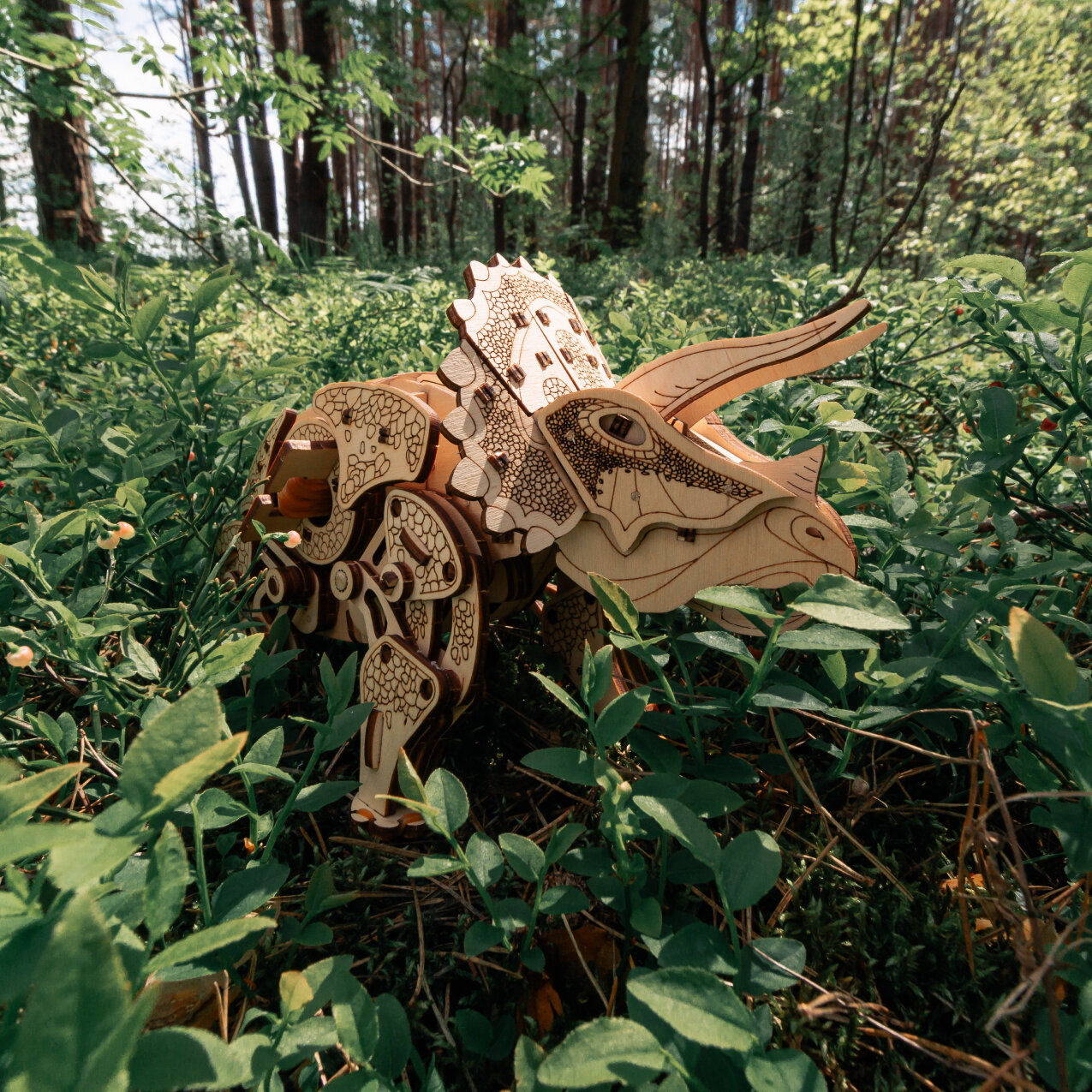 Модель из экологически чистых материалов, предназначенная для самостоятельной сборки и имеющая механизм, приводящий в движение. У механизма есть ручная заводка и возможность запускать и останавливать Динозавра. Конструкция деревянной модели позволяет ей двигаться максимально реалистично: во время движения Трицератопс качает головой и эффектно виляет хвостом, чем вызывает бурю положительных эмоций у детей и взрослых. Это идеальная игрушка, замечательный подарок и достойный предмет коллекционирования для дома и офиса.