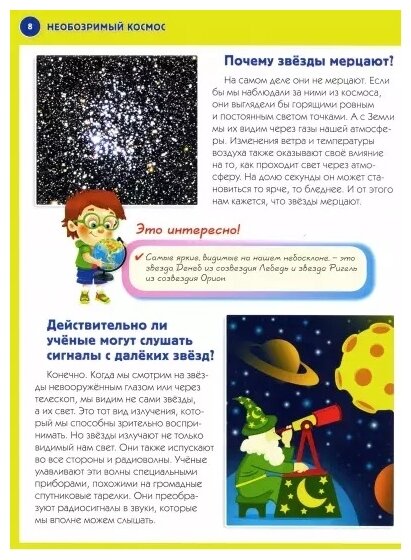 Дорогой друг! Ты когда-нибудь задумывался, почему ты икаешь? Или о том, почему кубики льда не тонут, а у зебры шкура в полоску? Отчего взрывается воздушная кукуруза? В нашей иллюстрированной энциклопедии есть ответы на эти и многие другие вопросы, которые, возможно, не раз ставили тебя в тупик. Ты побываешь в неизведанных глубинах космоса, прогуляешься по нашей замечательной планете, встретишься с удивительными животными, узнаешь много нового о себе и своём теле, и на все свои самые неожиданные вопросы получишь простые и ясные ответы, которые мы предлагаем тебе на страницах нашей книги. Они помогут тебе легко понять причину многих странных явлений, с которыми ты сталкиваешься на каждом шагу. Приготовься произвести впечатление на родителей, друзей и даже учителей своими новыми знаниями!