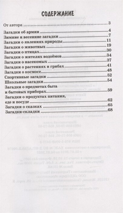 В сборник вошли загадки по самой разнообразной тематике (армия, спорт, природа, животные, одежда и обувь, транспорт времена года, космос и др.), которые помогут ребенку всесторонне развиваться.