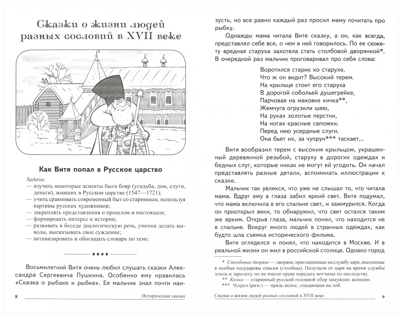 После каждой сказки даются вопросы и задания, а также иллюстративный материал (исторические картины русских художников), помогающие закрепить новые знания и представления.