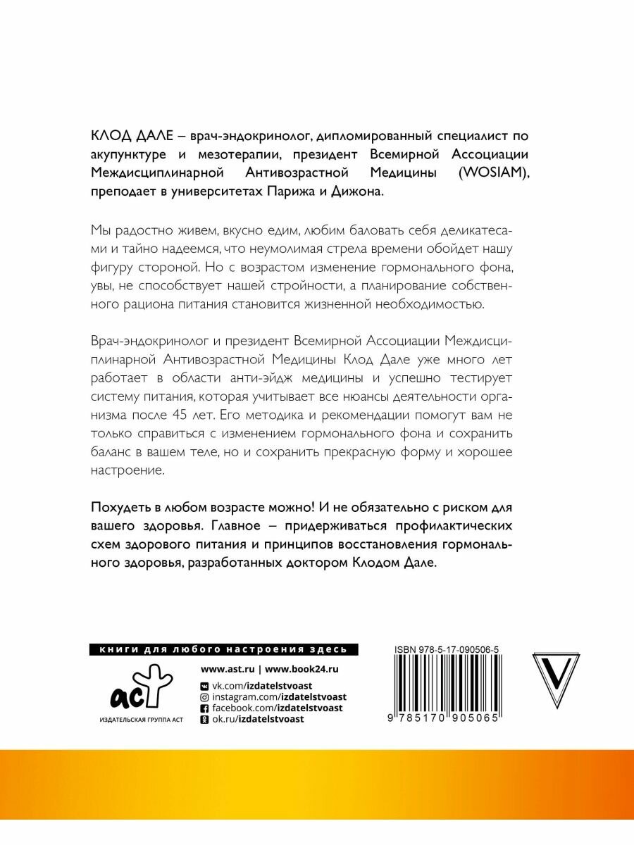 Врач-эндокринолог и президент Всемирной Ассоциации Междисциплинарной Возрастной Медицины Клод Дале уже много лет работает в области анти-эйдж медицины и успешно тестирует систему питания, которая учитывает все нюансы деятельности организма после 45 лет. Его методика и рекомендации помогут вам не только справиться с изменением гормонального фона и сохранить баланс в вашем теле, но и сохранить прекрасную форму и хорошее настроение.