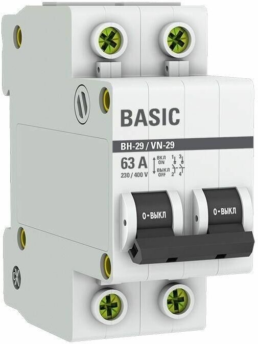 Выключатели нагрузки ВН-29 EKF Basic предназначены для оперативного управления участками электрических цепей. Выключатели производятся в одно-, двух-, трех- и четырехполюсном исполнениях. ПРЕИМУЩЕСТВА. Качество соответствует мировым стандартам. Удобство работы и надежность использования. Экономия бюджета 10-50% по сравнению с европейскими брендами. Надежный и проверенный конструктив. ОПИСАНИЕ. Номинальный ток выключателя нагрузки. Номинальное напряжение - напряжение переменного тока, при котором выключатель работает в нормальных условиях. ПРИМЕНЕНИЕ. Выключатели ВН-29 предназначены для коммутации активных и индуктивных нагрузок, включая двигатели, уже защищенные другими коммутационными аппаратами. НАЗНАЧЕНИЕ. Выключатели нагрузки типа ВН-29 серии Basic являются механическими коммутационными аппаратами и применяются для оперативных включений и отключений в электрических цепях переменного тока. Выключатели ВН-29 предназначены для коммутации активных и индуктивных нагрузок, включая двигатели, уже защищённых другими коммутационными аппаратами. Выключатели нагрузки соответствует ГОСТ IEC 60947-3.