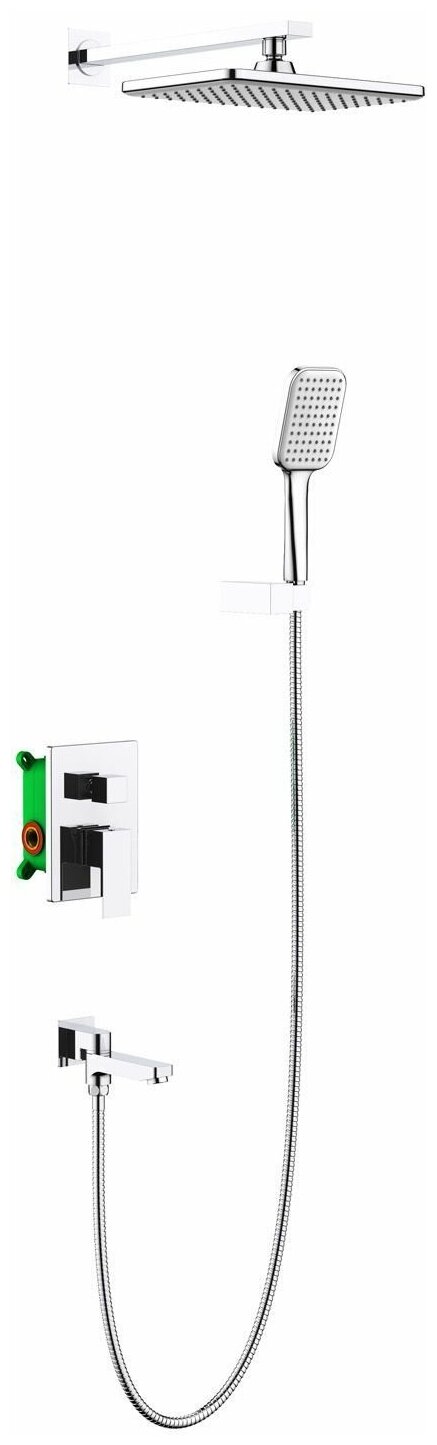 | Комплектация | душевая лейка, настенный держатель, смеситель, шланг для душа, шланговое подключение, верхний душ, излив, кронштейн для верхнего , инструкция |