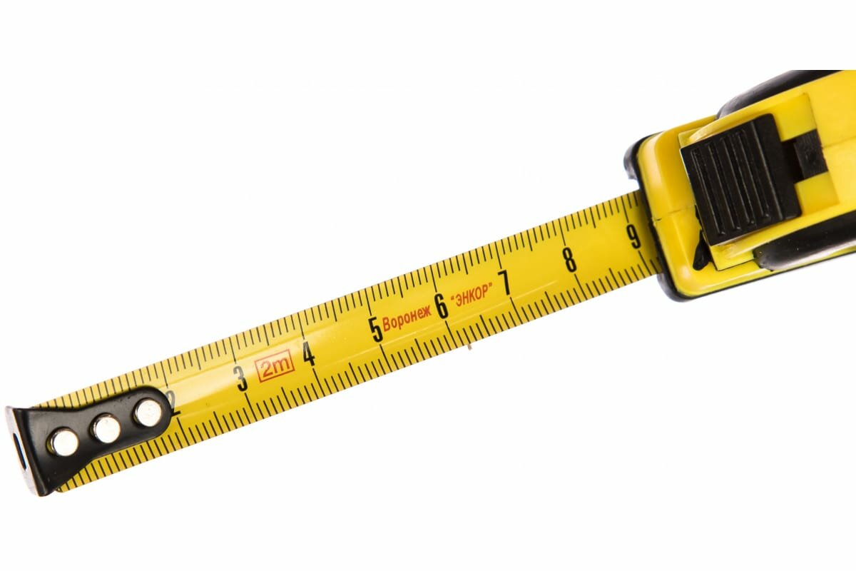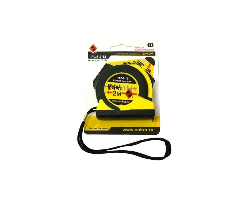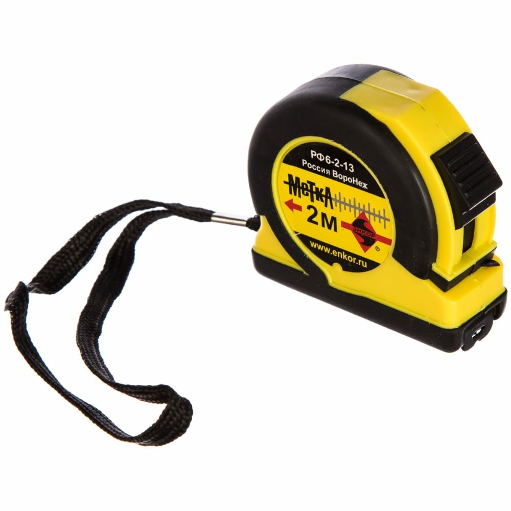 Рулетка Энкор Метка, 2м - эргономичное приспособление для обмера небольших линейных расстояний до 2-х метров. Корпус рулетки прорезинен, что не позволяет инструменту проскальзывать в руке. Благодаря тому, что крепление ремешка углублено, возможно проведение замеров с упором задней поверхности рулетки. Технические характеристики рулетки Энкор : Размер ленты - 2м х13мм; Длина - 2 м; Ширина ленты -13 мм; Материал ленты - сталь; Двусторонняя шкала - нет; Цвет ленты -желтый; Клипса для крепления на ремень - да; Вес нетто - 0.2 кг; Материал корпуса - обрезиненный пластик.