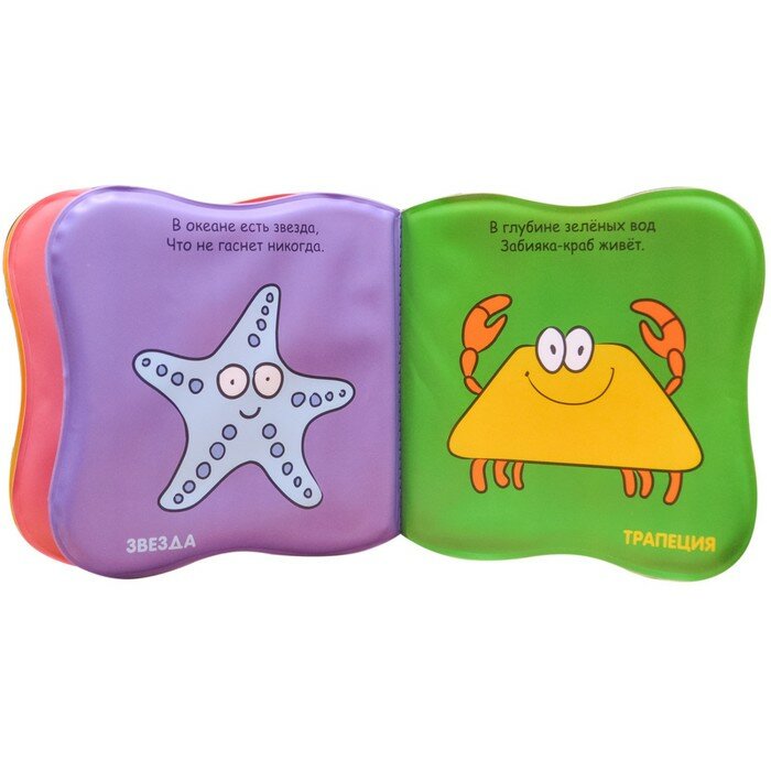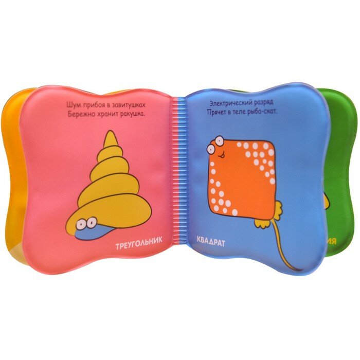 Книжка не боится воды, она очень мягкая и приятная на ощупь, а еще издает забавный писк. Крупные, яркие картинки познакомят вашего малыша с квадратом, кругом и другими формами.