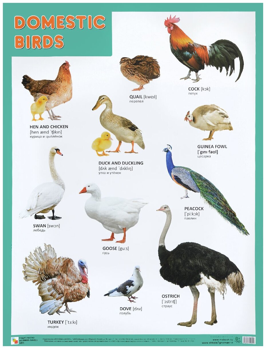 Плакат большого формата "DOMESTIC BIRDS" поможет детям в изучении английского языка. С его помощью они легко освоят новые слова по теме "Домашние птицы" и запомнят названия различных домашних птиц: павлин, цесарка, утка, страус, перепел и др.
