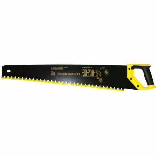 Ножовка по газобетону «Ворон» - инструмент необычный и интересный. Конструкция при первом рассмотрении напоминает обычную ножовку по дереву, но это не так. Полотно ножовки выполнено из стали 65Mn, как и в обычных ножовках, но толщина полотна значительно больше. Этот необходимый запас прочности позволяет работать с газобетонными блоками, не боясь деформаций полотна и ненужных перекосов. Часть зубьев этой ножовки выполнена из твёрдого сплава, так как материал для работы с которым она предназначена, обладает повышенной абразивностью.