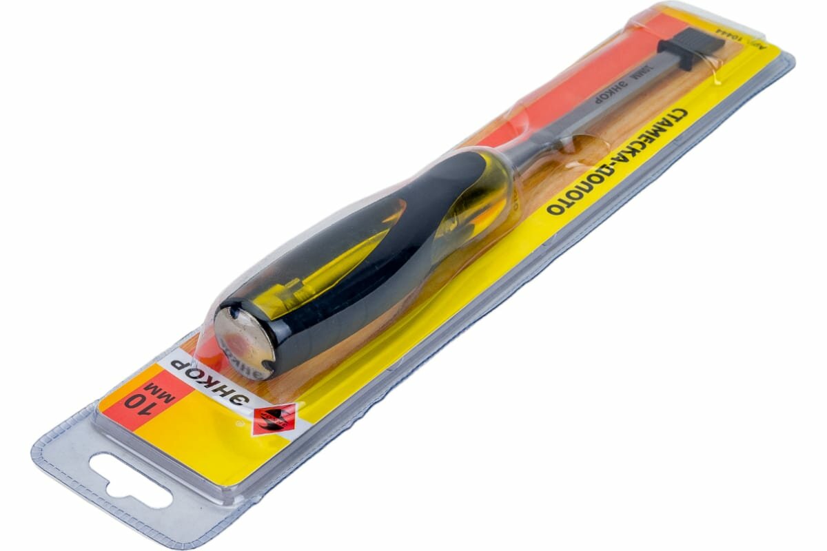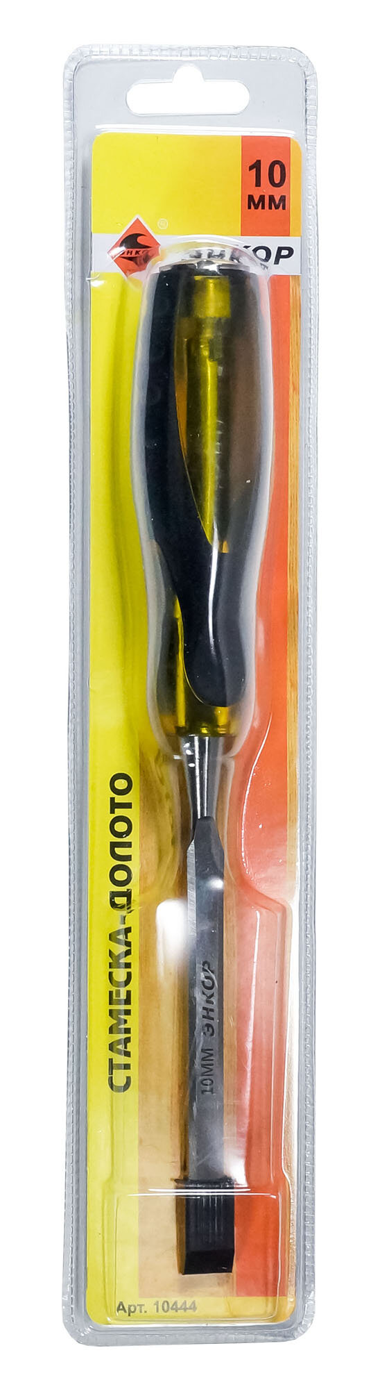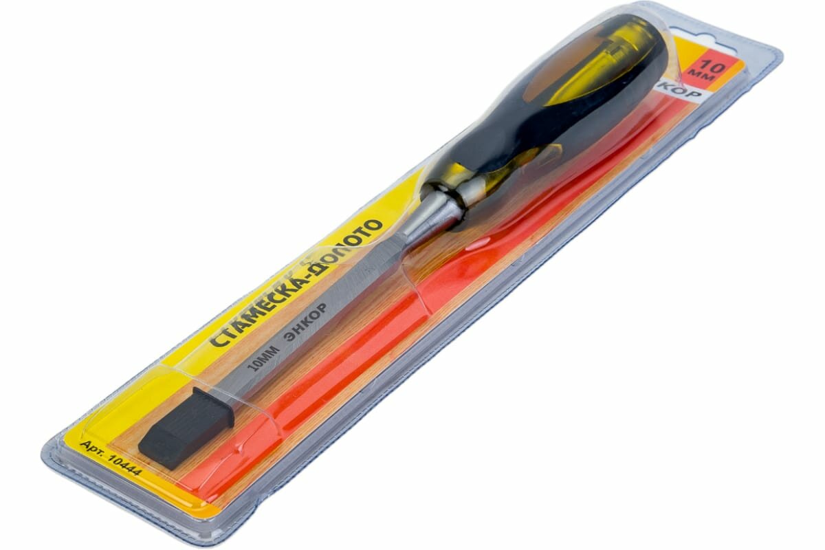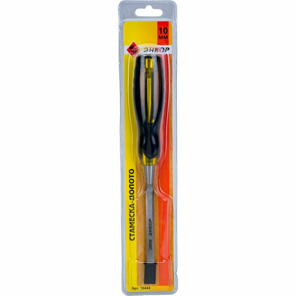 Стамеска-долото 10 мм Энкор представляет собой ручной инструмент для работы с деревянными заготовками, например, строгания, прорезания отверстий, пазов и пр. Стамеска-долото состоит из удобной пластиковой ручки и прочного стального полотна шириной 10 мм.