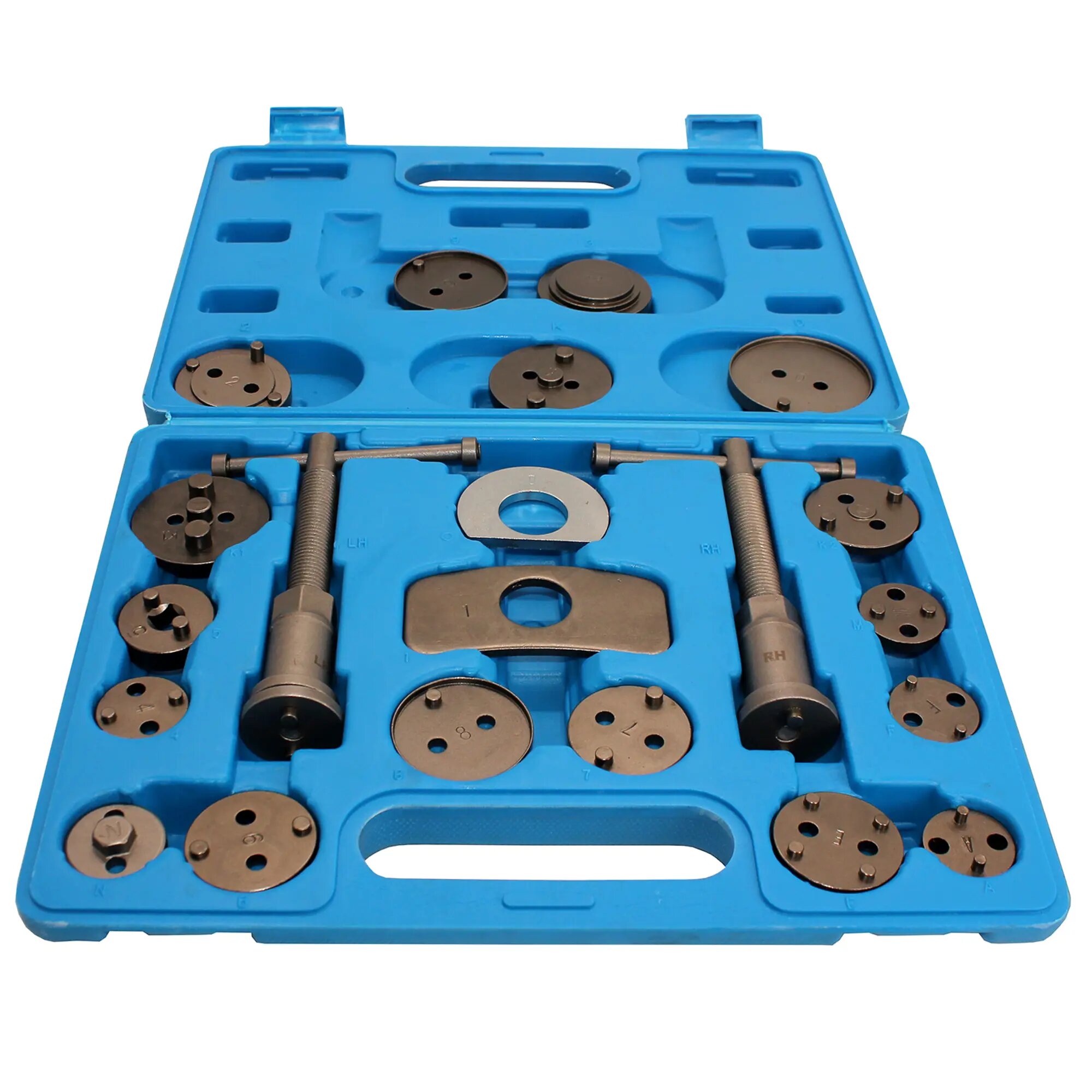 Инструмент сведения тормозных цилиндров это набор из 21 приспособления для утапливания поршней цилиндров тормозов с правосторонней и левосторонней резьбой. Комплект инструментов универсален и подойдет для ремонта практически всех легковых автомашин. Состав: болты с правой и левой резьбой, 2 опорные пластины, 17 адаптеров. Преимущества: - Инструмент выполнен из высококачественного металла. - Эргономичный кейс позволяет удобно хранить и перемещать содержимое. - На данный набор действует годовая гарантия.