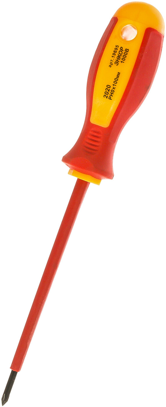 Диэлектрическая крестовая отвертка PH0х100мм Энкор служит для монтажа и демонтажа резьбовых соединений с крестовым шлицем и под напряжением до 1000В. Стержень изготовлен из хромванадиевой стали, на которой расположено диэлектрическое покрытие. Рукоять из двухкомпонентного материала не скользит в руке, обеспечивая тем самым удобную работу.