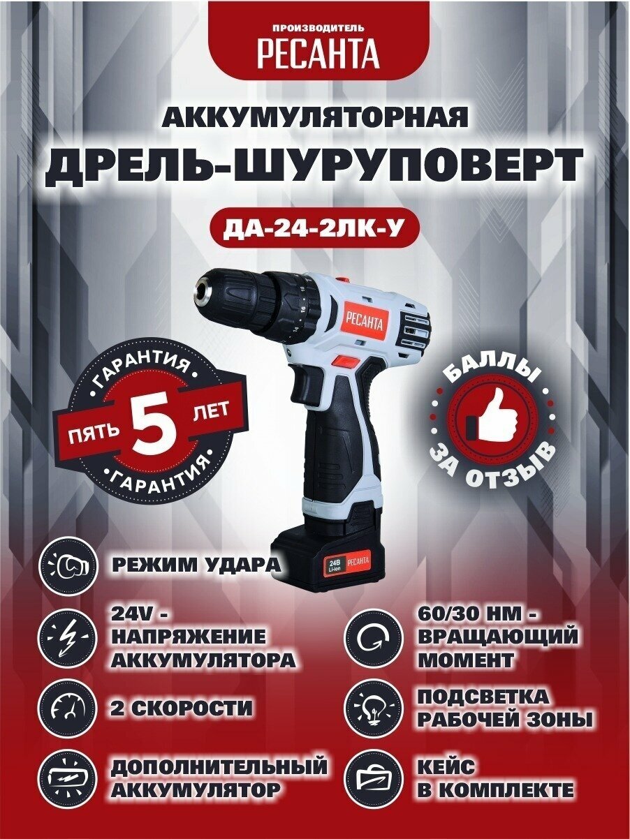Ударная дрель-шуруповерт РЕСАНТА ДА-24-2ЛК-У 2Ач с двумя аккумуляторами [75/14/8]