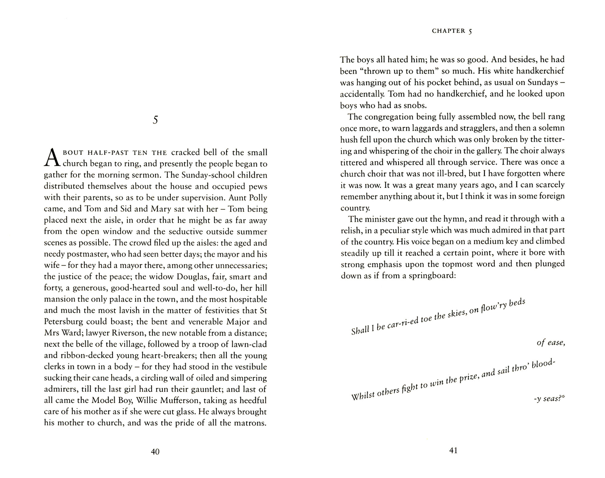 The Adventures of Tom Sawyer charts the escapades of a thirteen-year-old boy growing up on the banks of the Mississippi. Testing the patience of his aunt Polly, the bold and sharp-witted Tom Sawyer frequently skips school in search of excitement, and the scrapes he gets into with his friend Huckleberry Finn range from innocent japes to more serious events such as the witnessing of a murder.