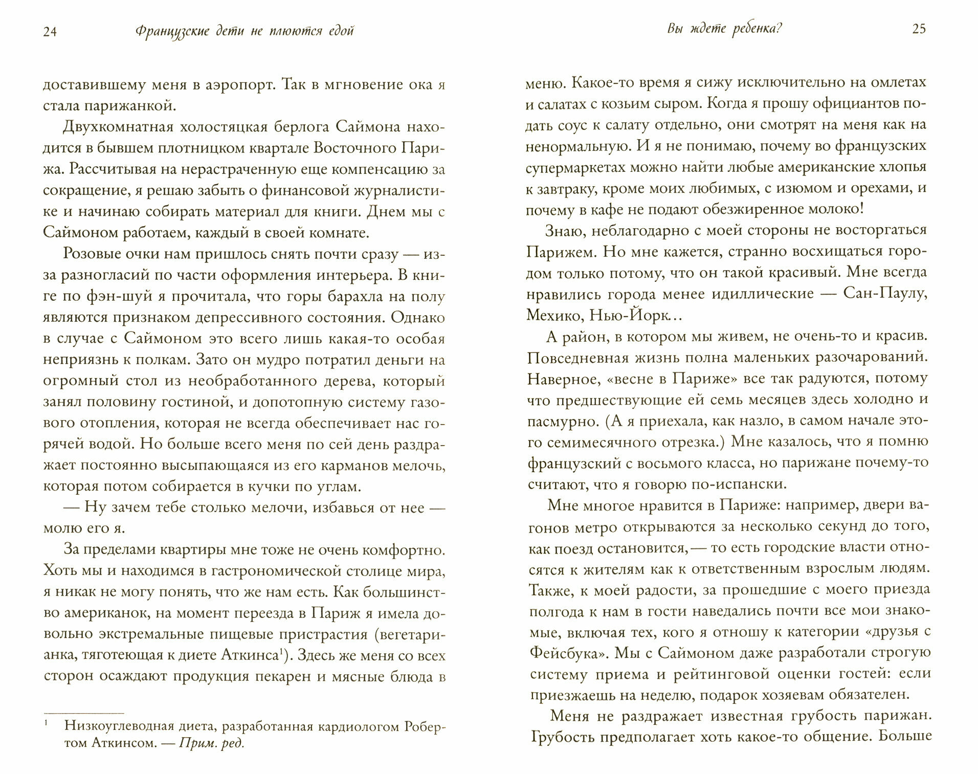Мне книга понравилась. Хотя когда я ее только увидела, читать не хотелось - из-за названия (есть у меня предубеждение, что если автор называет книгу подобным образом, то только потому что хочет продать побольше именно за счет вызывающего названия, а содержание на самом деле скудное и банальное). В конце концов, я не так часто встречаю детей, которые плюются едой! Но не надо, как выяснилось, воспринимать буквально. Много положительных отзывов на книгу убедили меня её открыть. И все равно, на мой взгляд, больше бы отражало идею книги такое название: "Как мы растили билингвального ребенка или некоторые особенности воспитания детей во Франции". В целом, книга представляет из себя увлекательный рассказ из жизни молодой пары (американка и англичанин), которые решили пожить в Париже, а затем родить там ребенка. С чем столкнулись иностранцы в новой стране, как обживались и строили отношения с французами и, наконец, с чем столкнулись при беременности и воспитании детей. Автор восхищается системой воспитания детей во Франции, она всячески старается её изучить и использовать в собственной жизни, а затем передать читателю основные идеи. Сравнивает она французское воспитание с американским, но многие выводы и наблюдения могут коснуться родителей и детей любой страны. Как добиться, чтобы дети не капризничали по любому поводу в общественном месте? Подчинить свою жизнь требованиям ребенка (пожертвовав многими своими потребностями) или грамотно разделить взрослое и детское, позволяя себе, воспитывая ребенка, жить полноценной взрослой жизнью? Как? Как кормить детей, если они растут маленькими привередами? (Эта глава мне показалась для реализации особенно сложной). С какого возраста детские сады и лагеря? Как укладываться спать? Много других вопросов коснулась автор. Это не научное исследование, а житейское, но оно содержит, в том числе, компиляцию выводов ученых по разным вопросам психологии воспитания (что совсем не лишне). И в результате получилась увлекательная и умная книга. Я действительно с удовольствием прочитала её. Надеюсь, что на практике получится следовать определенным грамотным советам.