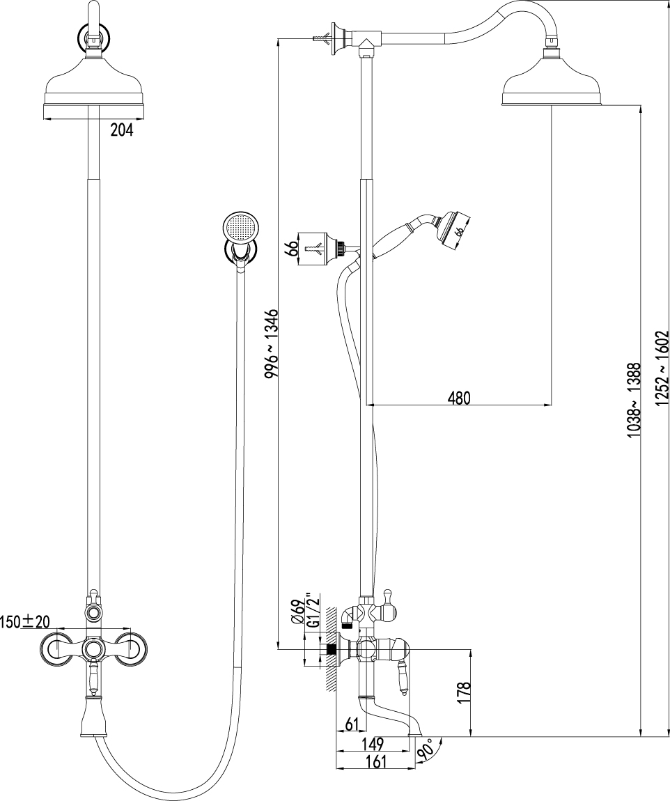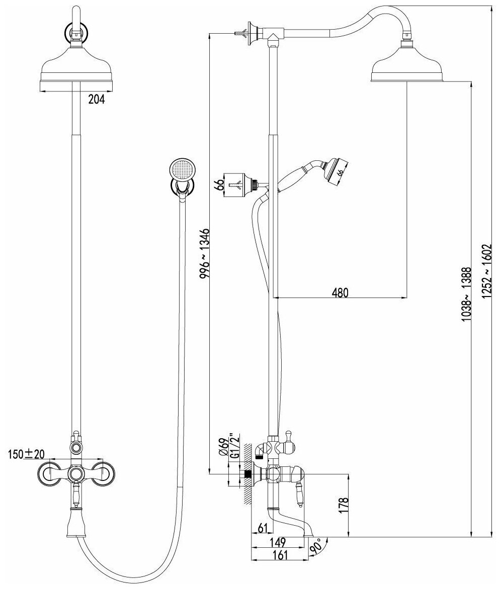 | Комплект поставки | Душевая стойка; верхний душ; смеситель; душевая лейка; душевой шланг; держатель для душа |