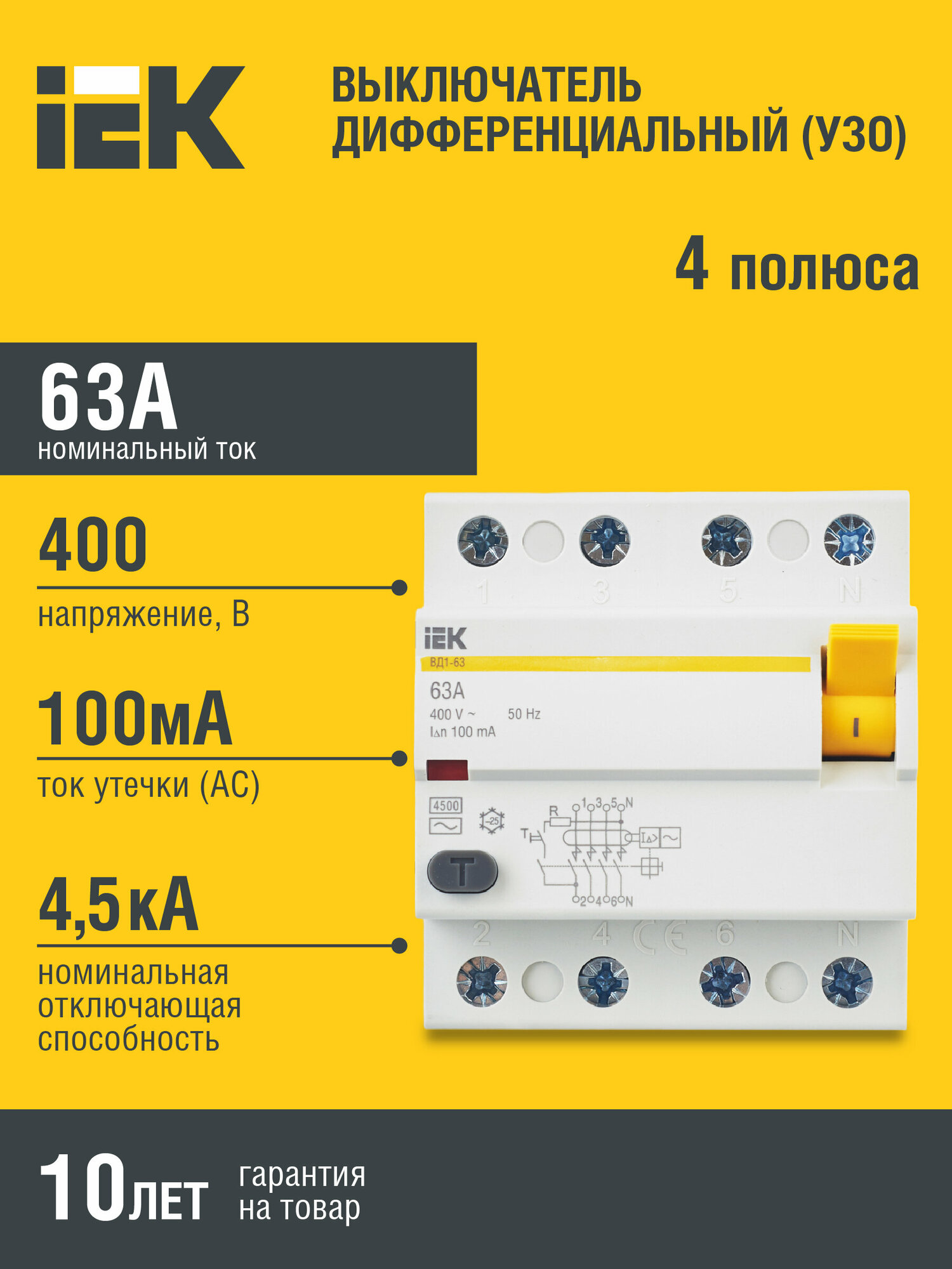 Выключатель дифференциального тока четырехполюсный 80А 100мА IEK ВД1-63 MDV10-4-080-100 (тип AC)
