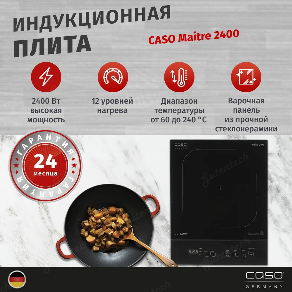 | Прочие особенности и свойства | Настольная плитка CASO Maitre 2400 со стеклокерамической варочной панелью для быстрого разогрева и приготовления разнообразных блюд в металлической посуде, обладающей ферромагнитными свойствами. Благодаря современному элегантному дизайну, компактным размерам, простоте и безопасности в использовании, плита станет не только незаменимым помощником на кухне, но и её стильным украшением. У данной модели большая зона нагрева, очень простая и легкая очистка, автоматическое распознавание посуды.,Настольная плитка CASO Maitre 2400 со стеклокерамической варочной панелью для быстрого разогрева и приготовления разнообразных блюд в металлической посуде, обладающей ферромагнитными свойствами. Благодаря современному элегантному дизайну, компактным размерам, простоте и безопасности в использовании, плита станет не только незаменимым помощником на кухне, но и её стильным украшением. У данной модели большая зона нагрева, очень простая и легкая очистка, автоматическое распознавание посуды. |