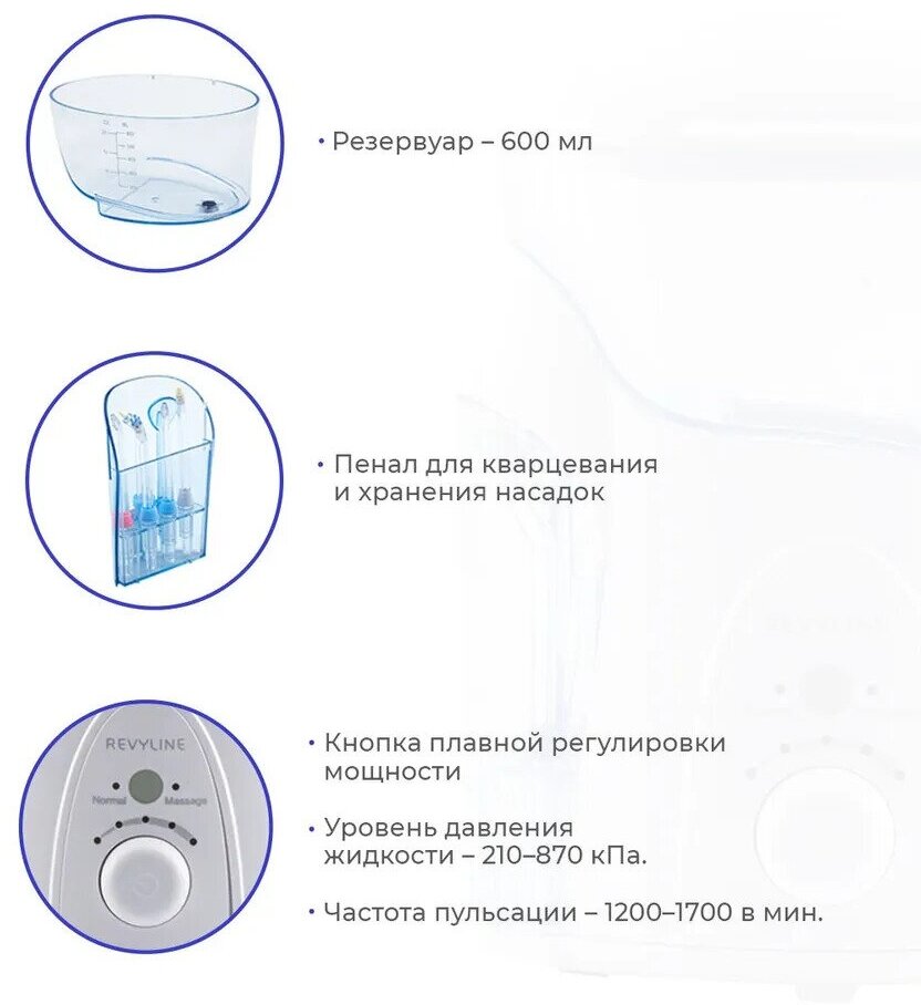 Стационарный ирригатор Revyline предназначен для эффективного очищения труднодоступных мест полости рта - межзубных промежутков, дальних зубов, помогает справиться с налетом при различных ортодонтических конструкциях и массажирует десны.