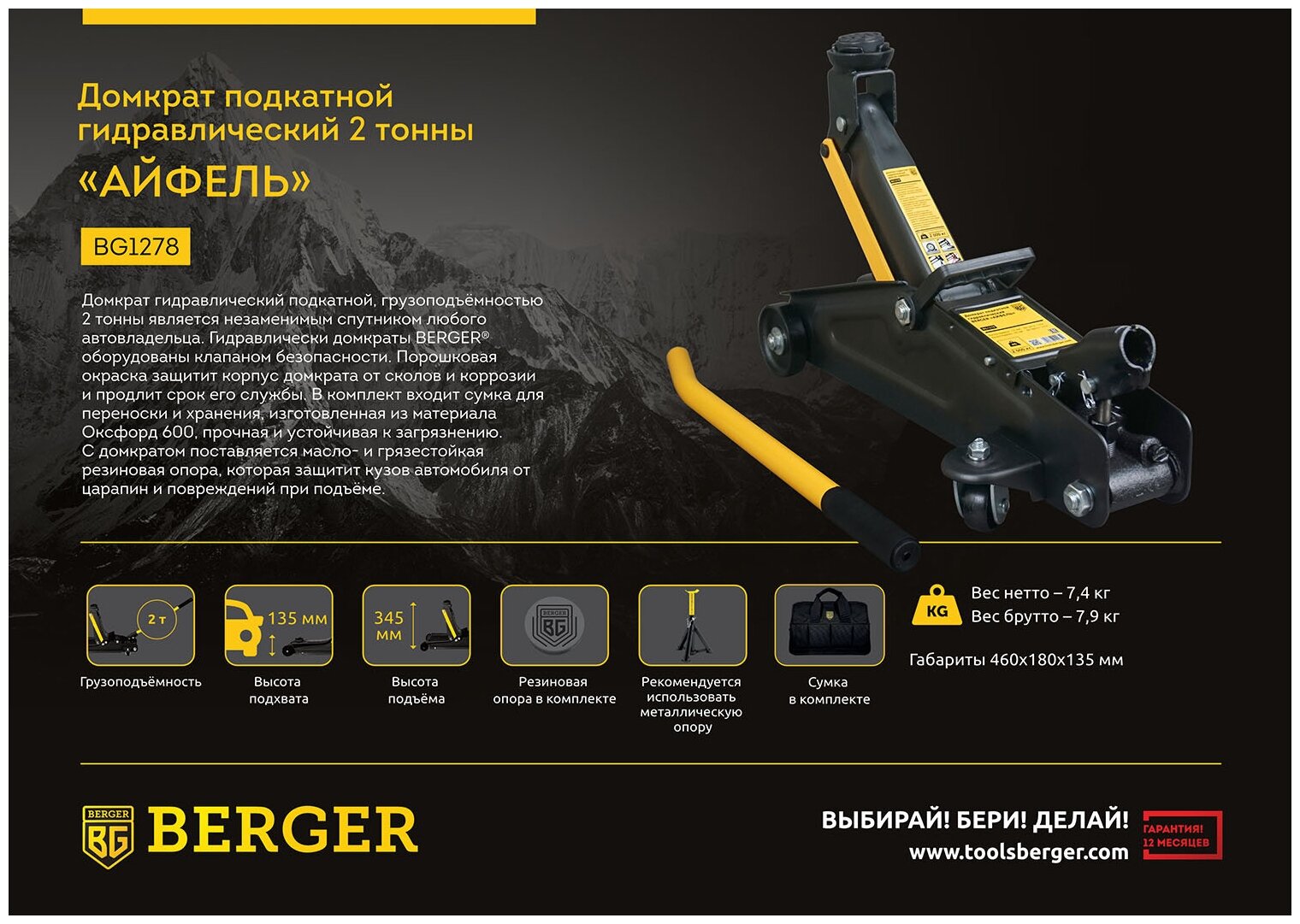 - Обзор подкатных домкратов BERGER в прочной сумке BG1278 «АЙФЕЛЬ» 2т BG1279 «КОТМАР» 2 7т