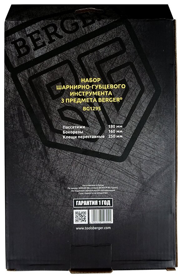 | Прочие особенности и свойства | Набор шарнирно-губцевого инструмента 3 предмета Berger BG BG1295 используется для зажима, удержания, перекусывания проволок, лески, кабелей и т.д.,Захватные части выполнены из хромованадиевой стали, поэтому обладают повышенной прочностью. Твердость рабочей части инструментов - 52-62 HRC.,Рукоятки выполнены из двух материалов, не скользят и обеспечивают продолжительную работу без усталости. |