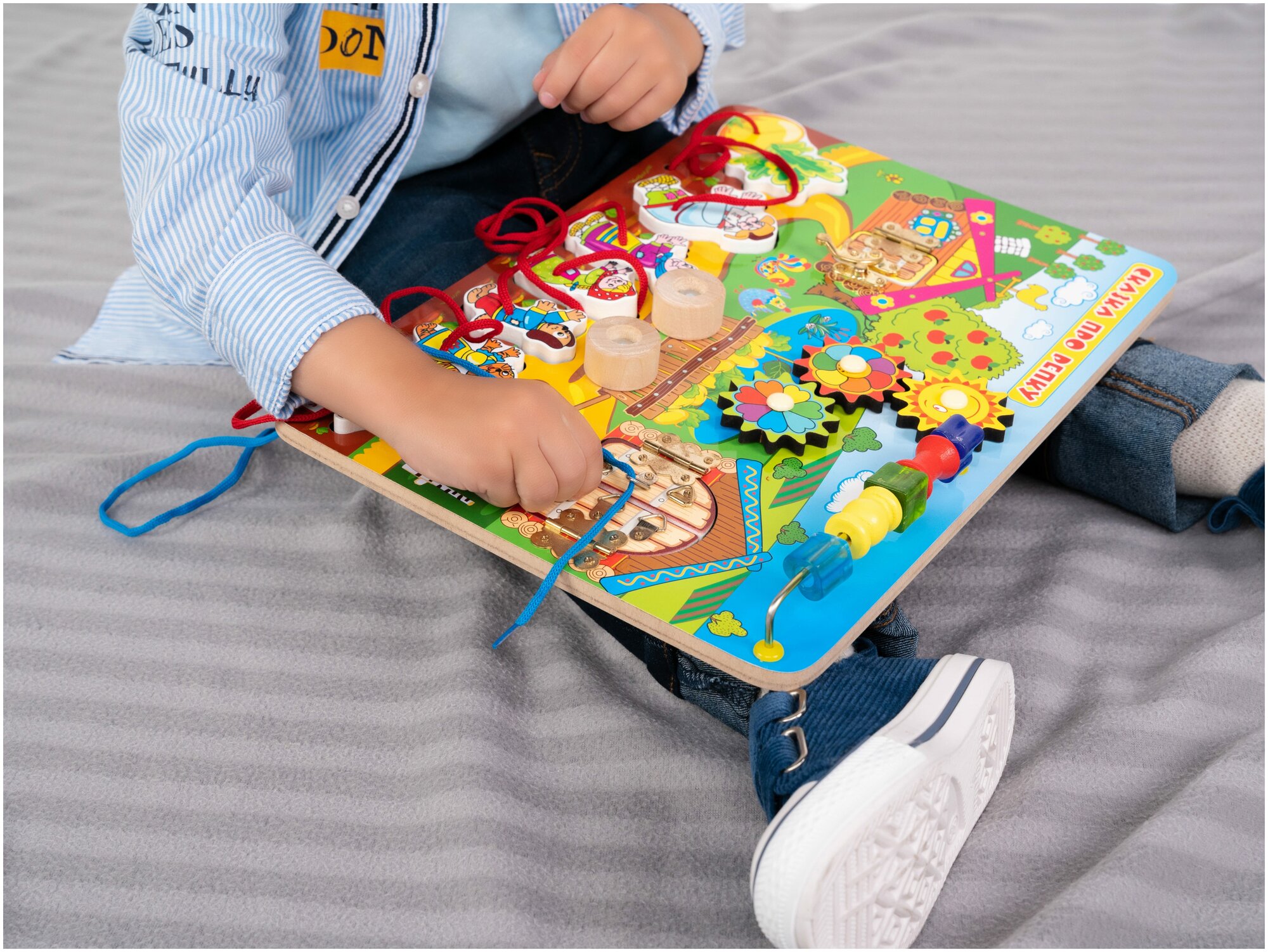 Бизиборд- это развивающая доска (стационарная или мобильная) с закрепленными на ней предметами, которые обычно интересуют малышей в доме. Ребенок познает принцип действия многих вещей из жизни взрослого человека. При этом игра не представляет опасности и увлекает детей на продолжительное время. Впервые педагог Мария Монтессори предложила перенести подручные бытовые предметы на стенд для изучения. Дети открывают дверки, двигают щеколды, поднимают крючки, застегивают молнию, фиксируют вилку в розетке, таким образом изучая функциональность вещей без участия родителей.