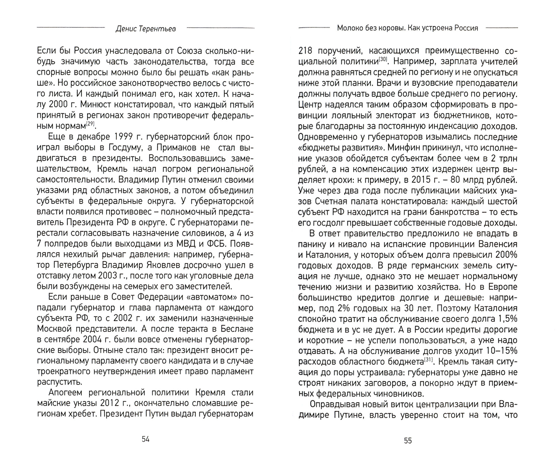 Тираж книги всего 500 экземпляров, ее никогда не будут рекламировать и пиарить. И это печально. Книга в некоторой части является продолжением «Русской модели управления» Александра Прохорова, только с учетом последних 20 лет истории. Денис Терентьев через призму сравнения отдельных регионов и периодов жизни страны пытается ответить на вопрос, почему потуги государства на повышение уровня жизни населения по большей части являются обманом этого населения, и какова в этом непосредственная роль местного «элит». Удивительно что книга была опубликована, так как в ней отчетливо прослеживается критика не только власти, но и РПЦ. Отрадно, что описаны скромные примеры исключения из общего правила – отдельные богом забытые места, где удаленность играет в пользу и люди куют свое счастье сами, не ожидая его от государства.