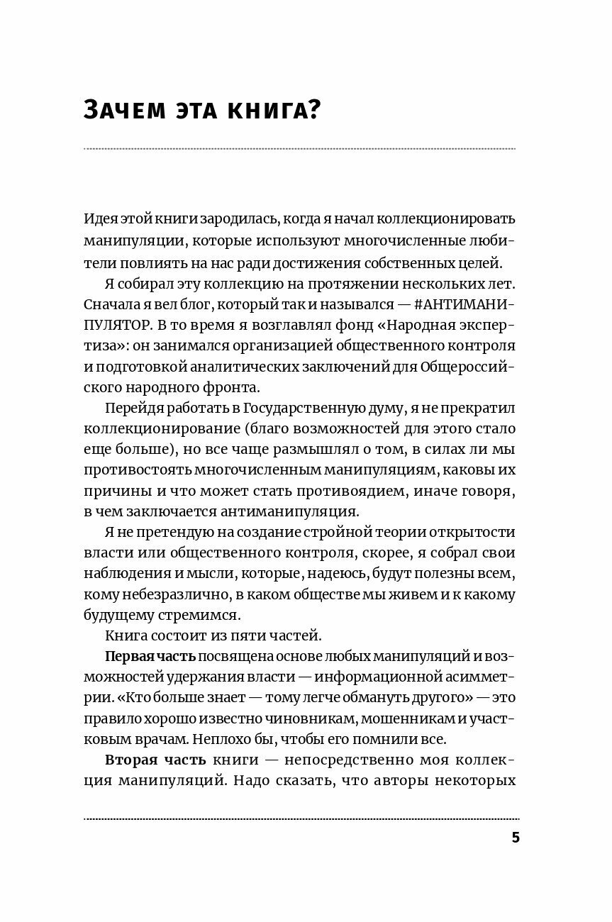 Почему так происходит? С помощью практических примеров автор книги раскрывает, как недобросовестные чиновники создают видимость достижения результатов, виртуозно жонглируя словами и цифрами, и рассказывает, как противостоять этим манипуляциям. Основываясь на личном опыте организации общественного контроля, автор призывает к созданию понятной и доступной (а не фиктивной, как сейчас) формы открытой государственной системы и отстаивает гражданскую активность как важное средство в борьбе за эффективность власти.
