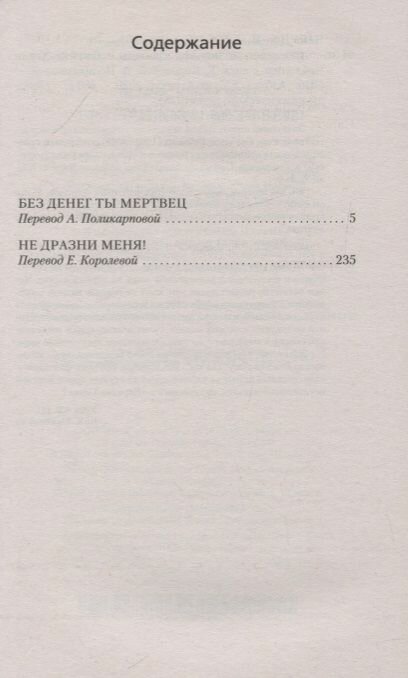 В сборник вошли романы "Без денег ты мертвец" (1972) и "Не дразни меня!" (1979), относящиеся к циклу "Парадиз-Сити". Жизнь курортного городка неподалеку от Майами может показаться неспешной и размеренной лишь на первый взгляд. Чужое богатство не дает покоя тем, кому не повезло нажить собственного, а хитроумная афера кажется верным способом исправить эту несправедливость: увы, вместо легкого барыша кража бесценной коллекции "русских марок", сулит незадачливым мошенникам опасный конфликт с настоящим магнатом преступного мира.